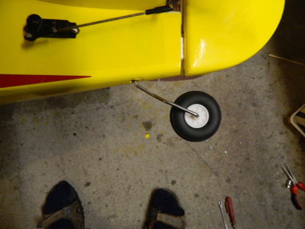 Jaczek ma za sobą dość intensywne loty. W trakcie lotów jednak wyszło parę usterek konstrukcyjnych. Po pierwsze zupełną pomyłką było podwozie ogonowe w moim wykonaniu. Pogięło się, wykrzywiło i puściły luty. Do wyrzucenia. Do tego gwint nakrętki pazurkowej w kadłubie stracił gwint. Porzuciłem redukcję, z kawałka drutu sprężynowego 3 mm zrobiłem nową goleń, końcówkę nagwintowałem. Musiałem wykonać otwór w kadłubie, żeby od wewnątrz przykręcić nakrętką koło.