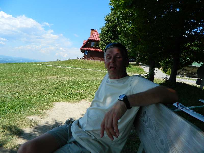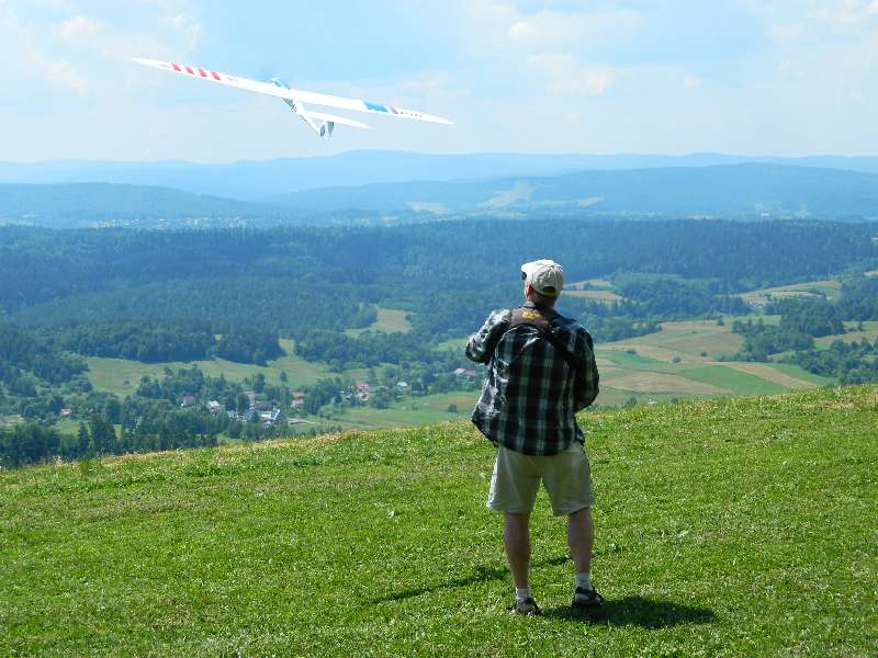 Przyjechaliśmy na miejsce ok 10 rano. Szybowisko budziło sie powoli do życia. Szybowce powoli zlatywały za pomocą startu grawitacyjnego na dół lotniska. Po chwili szczyt był pusty. Przywitalem się z grupką modelarzy, poznałem Pana Piotra Piechowskiego. Krótka rozmowa z "szefem", Piotrem, dowiaduję się, że cały szczyt jest dla nas. Uważać tylko na duże szybowce, wyciągarkę. Modele poustawiane w cieniu drzew, szybki rzut oka na maszyny....kurde, obciach wyciągać "39", wszystko to zestawy....chude, smukłe, błyszczące, naszpikowane elektroniką :oops: Ale co tam, myślę, ze nieważne czym się lata, ale jak się lata...jechać 800 kilosów po to tylko żeby popatrzeć ;) Paru kolegów poszło w górę, narzekają, brak wiatru, termika słaba. Ok, składam swojego grata, sprawdzenie sterów, silnika...i w górę :D Zaraz łapię komin, dosć mocny, wożę się na skraju góry, z jednego końca na drugi, opuszcza mnie zdenerwowanie i zwątpienie. Ogarnia mnie spokój. Kominy silne, wykręcam się na dość duże wysokości, parę fikołów i znów do komina, w górę. Silnika używam bardzo rzadko. Przylatują duże szybowce, można powiedzieć , że latamy razem :D . Piotr startuje swoim modelem, jakiś zestaw, ma uruchomioną termikę, skwapliwie korzystam z odgłosów jego radyjka, wożę się za nim, ale po chwili zrezygnowałem....chyba noszenia go nie interesowały. Była grupa modelarzy szybowników, startowali z holu gumowego :) Fajnie to wyglądało.