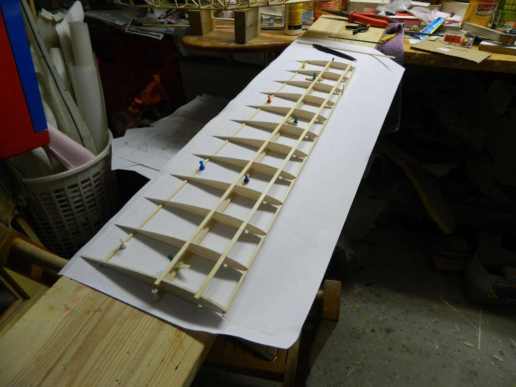 Budowy CW-1 ciag dalszy. Pracuję na płatami. Dzisiaj pierwsza przymiarka do łącznika....wykonany z dwóch warstw sklejki 2+3 mm. Podobny łącznik będzie w pasie przedniego dźwigara. Łączniki generują wznios trapezowej części płata, 3 st.