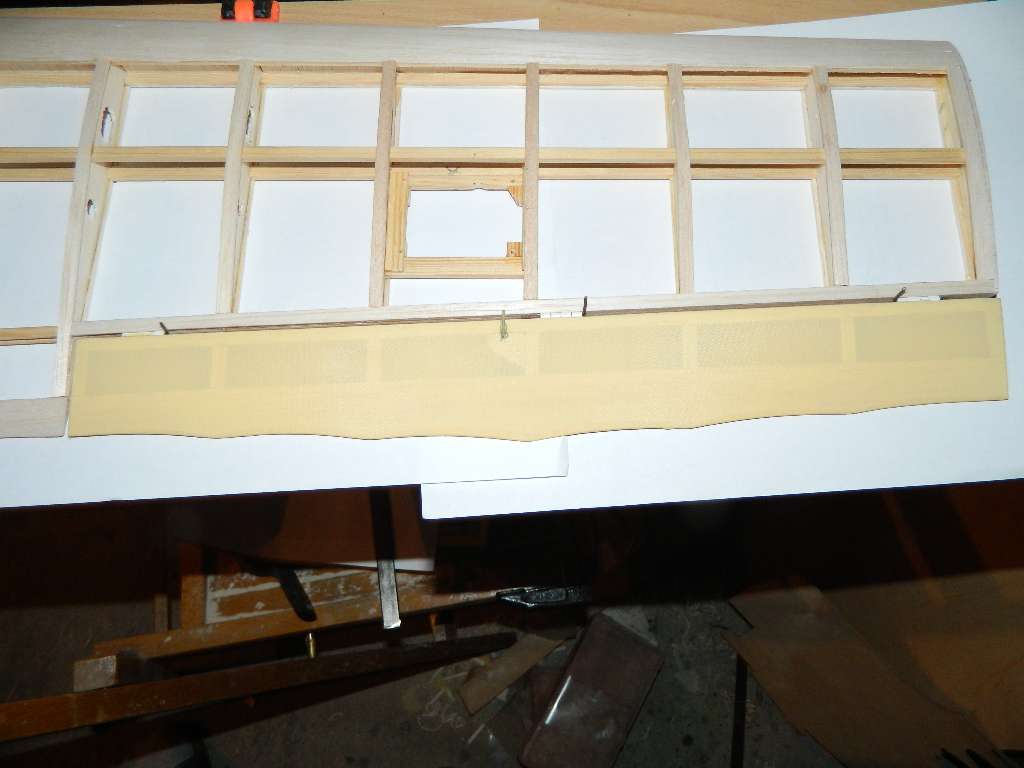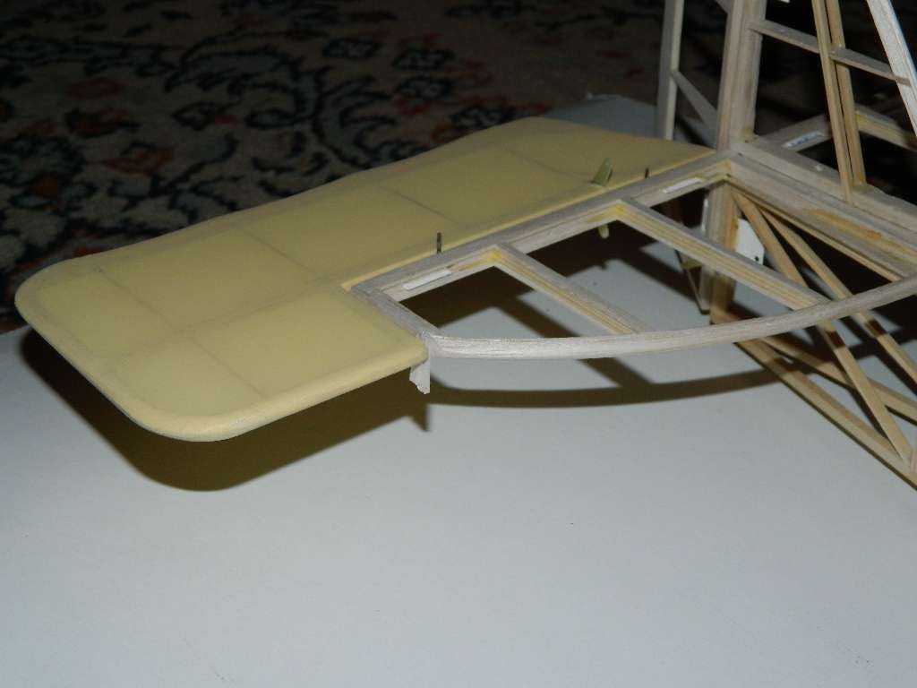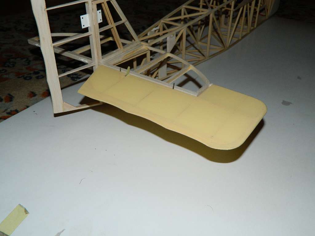 Folia kładzie się dobrze, nie miałem najmniejszych problemów, dla tych co dysponują żelazkiem modelarskim z pokrętłem, 3-3,5 przyklejanie, 4-4,5 naciąganie. Bardzo ładnie się przykleja, naciąga, nie wichrując konstrukcji. Jestem bardzo zadowolony z efektu, tzn, barwy pokrycia i jego faktury /kurde to faktycznie jest cieniutkie płótno :o /, o takim myślałem taki wydaje mi się jest odpowiedni. Oczywiście nie mam porównania z Oratexem. Delikatnie prześwitująca, ale nie rażą w oczy słoje od balsy. Zdjęcia zrobiłem w różnym oświetleniu, faktyczny odcień leży gdzieś pośrodku.