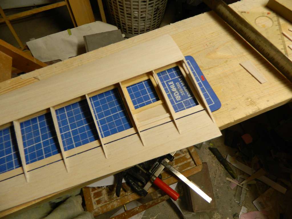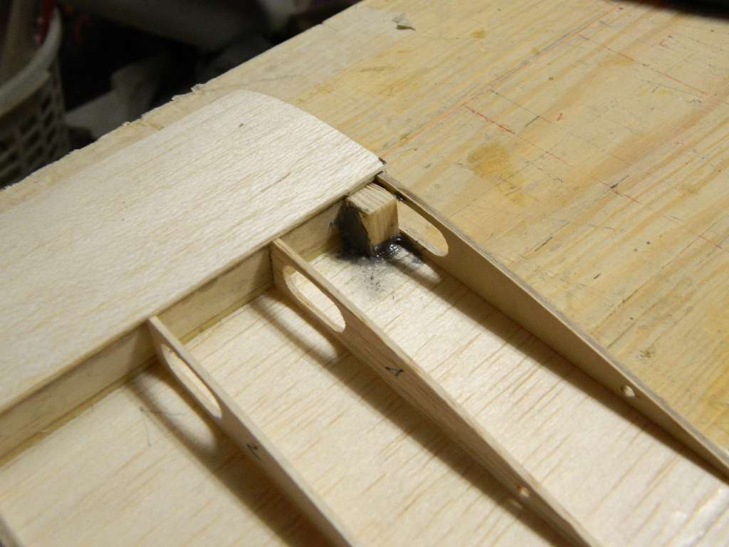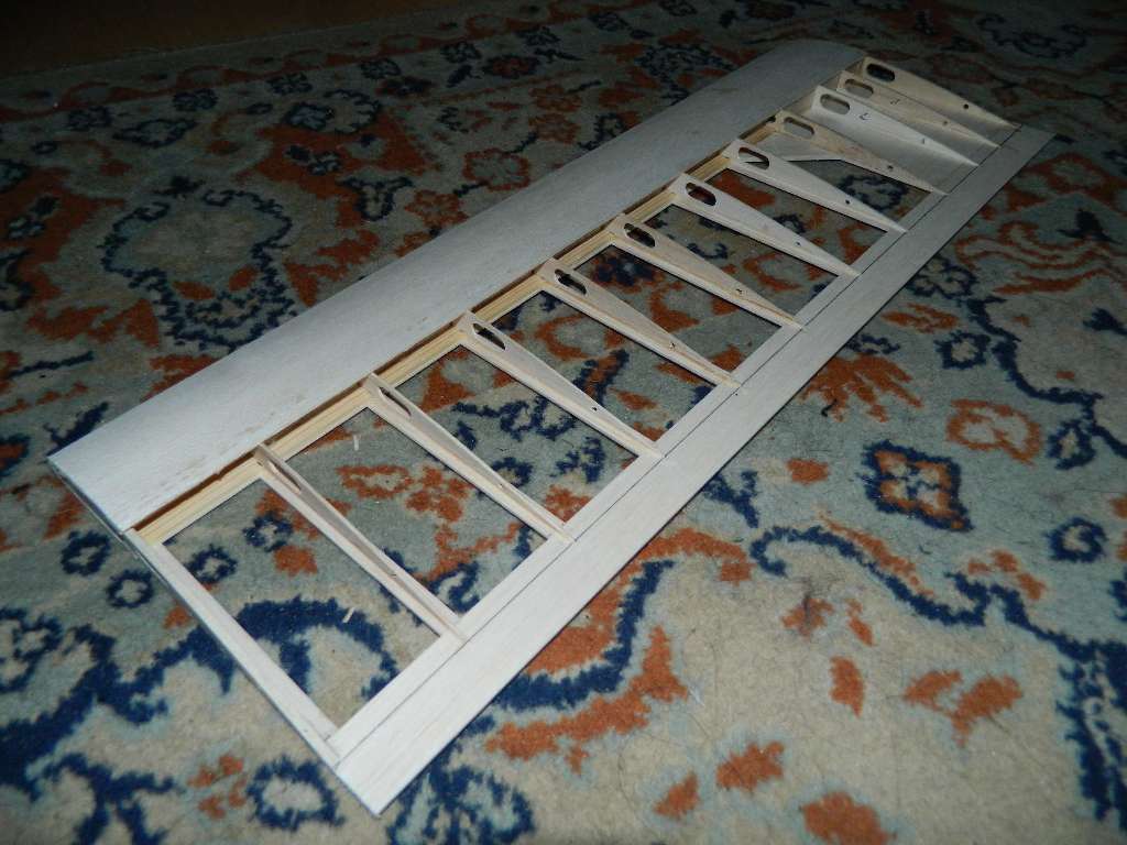Nakładki na żeberka zrobione z balsy 1,5 mm, szerokość 8 mm. Słoje balsy równoległe do żeberek. Przekładki międzydźwigarowe balsa 2 mm w części prostokątnej, 1,5 mm w części trapezowej, słoje prostopadłe do dźwigarów.