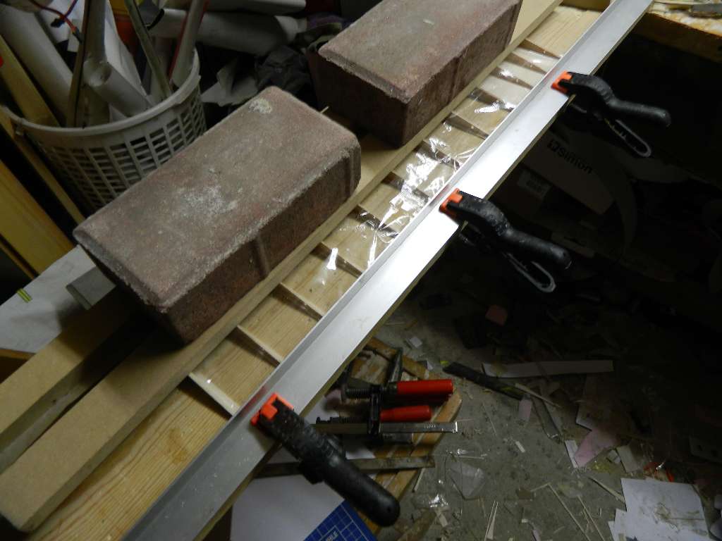 W części prostokątnej obie listwy kleiłem Soudalem 66A, ale widzę, że spływ jest, powiedzmy miękki. W części trapezowej skleję na żywicę, tak jak robiłem w płatach w elementarzu, czy innych. Żywica - Distal, Epidian czy L285 - daje bardzo sztywną, mocną spoinę dobrą do szlifowania, napewno nie należy używać klejów "wikolopodobnych".