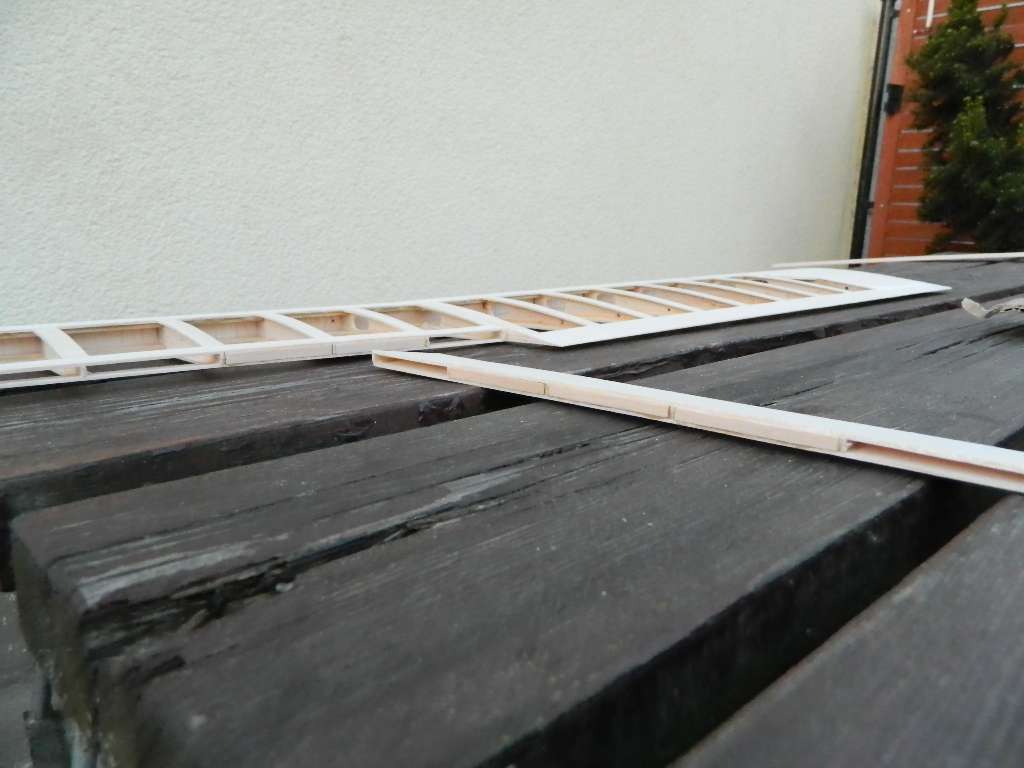 Górna część lotki przyklejona - niezawodny 66A....jednak, przyklejony również górny dźwigarek przylotkowy. Teraz czas na nakładki na żeberkach, szlifowanie wszystkiego, odcięcie lotki i połączenie obu części płata razem.