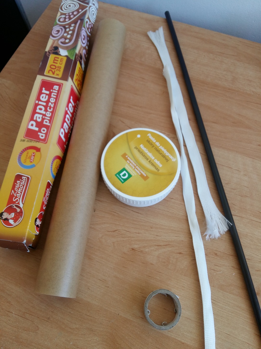 Następnie zdejmujemy z rurki odciętą część a samą rurkę - łącznik smarujemy pastą do butów - nie musi być ileś tam razy, wystarczy nałożyć pastę na papier toaletowy i przeciągnąć po rurce dwa trzy razy tak żeby ją pokryć na odcinku gdzie będzie przylegał papier. Rurka ma być tłusta a nie wypolerowana na błysk.