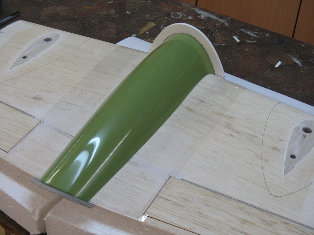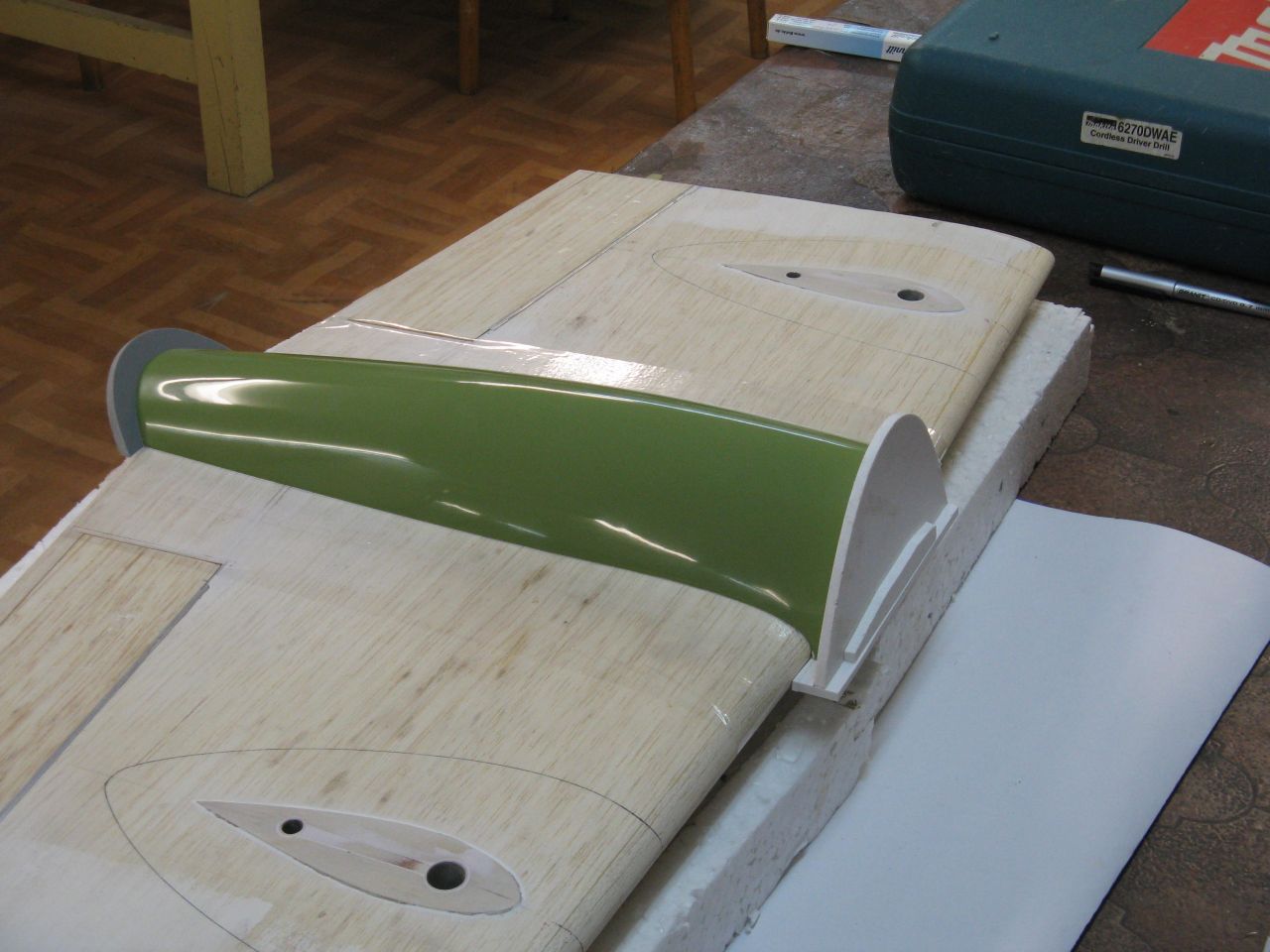 W skrzydła zostały wklejone rurki aluminiowe, w które wchodzą golenie . W większą rurkę pływaka wkleiłem tulejkę duralową z gwintem M3, a w skrzydła od góry - tulejkę mosiężną będącą prowadzeniem śruby mocującej pływak. Zdjęcia wszystko wyjaśniają.