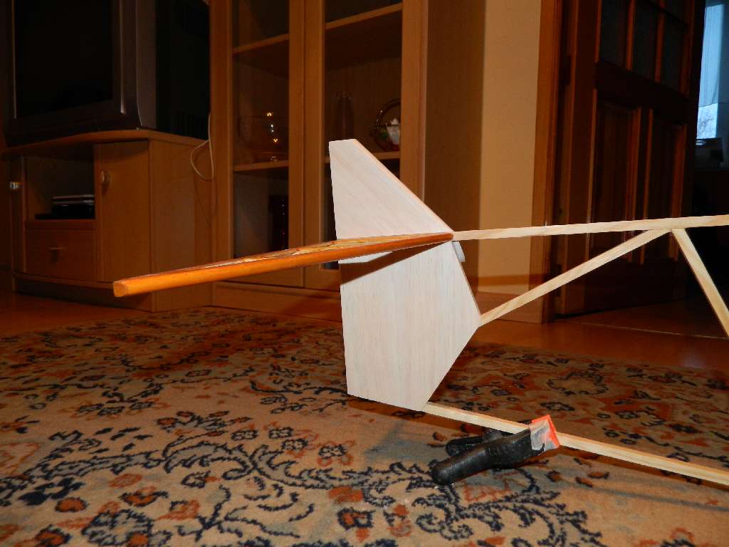 Konstrukcja statecznika oparta jest na kratownicy z listewek sosnowych 4x4 mm, natarcie i tylna część. Rozpórki z listewek sosnowych 4x2 mm. Wkleiłem kawałek rurki alu 4x3,1 mm przy tylnej listwie - tam wchodził będzie krótki łącznik z pręta węglowego fi 3mm. Na obie listwy nakleiłem listwy z balsy 2 mm, z góry i z dołu, przód 6 mm szerokości, tył 10 mm, listwa balsowa 10 mm również przyklejona u nasady statecznika. Na rozpórki nakleiłem listewki balsowe 3x2 mm. Dodatkowo wzmocniłem listwę u nasady statecznika, od wewnątrz, sosną 4x2. Na natarcie po wszystkim listwa balsowa 4 mm.