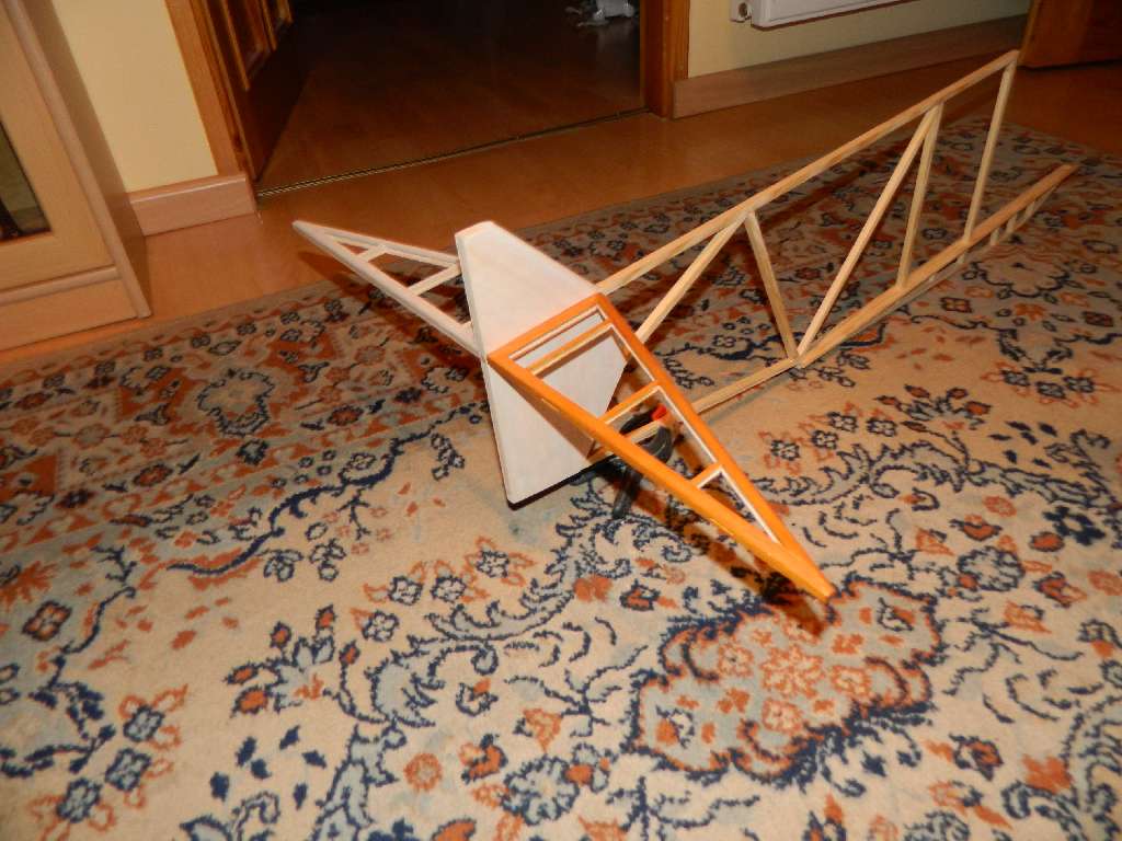 Głównym elementem nośnym steru wysokości jest listwa sosnowa 8x2 w natarciu. Do niej przyklejone żebra z balsy 3 mm, przestrzenie między żebrami w natarciu wypełnione balsą 2 mm. Ukośne żebra z balsy 2 mm. Spływ ze sklejki 1mm szerokości 5 mm, obustronnie oklejony balsą 3 mm na klej epoksydowy. Oba żeberka skrajne od zewnatrz wzmocnine sklejką 0,4 mm. Wszystko zeszlifowane na przekrój trójkątny. Wzmocnienia, nakładki ze sklejki 0,4mm.
