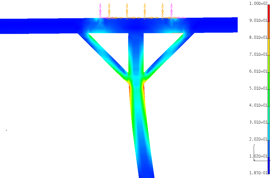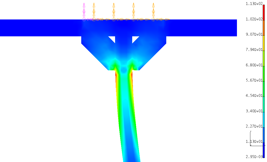 Kolorami przedstawiono naprężenia zredukowane. Po prawej stronie jest legenda. Na pierwszym screenie widać że największe naprężenia wynoszą 100. Celowo pomijam jednostki - nie jest to ważne. Wartość siły dobrana tak aby wyszło równo 100 (%). Na kolejnym screen-ie naprężenia zredukowane wynoszą o 13 więcej. Widać również, że naprężenia we wzmacniającym elemencie w 1szym przypadku są wyższe niż w drugim ale to bez znaczenia, bo i tak w tym miejscu nie są najwyższe. Maksymalne wartości występują tuż za wzmocnieniem (co jest normalne).