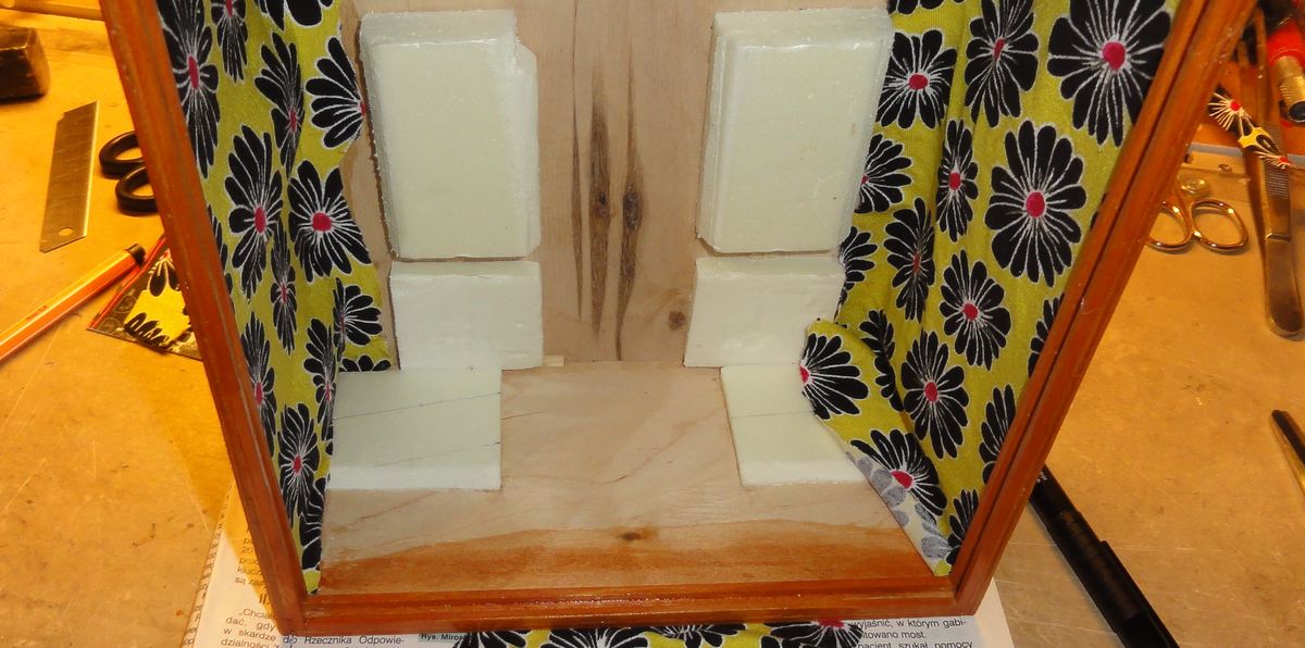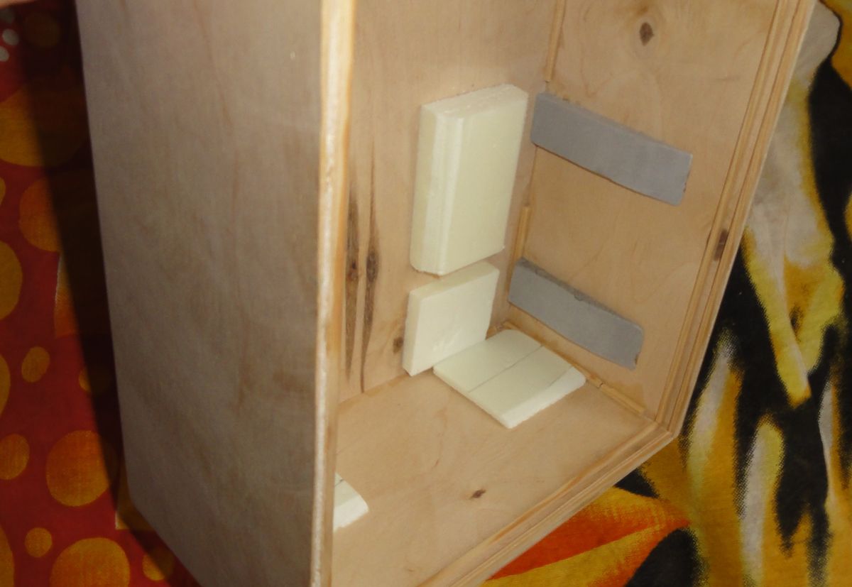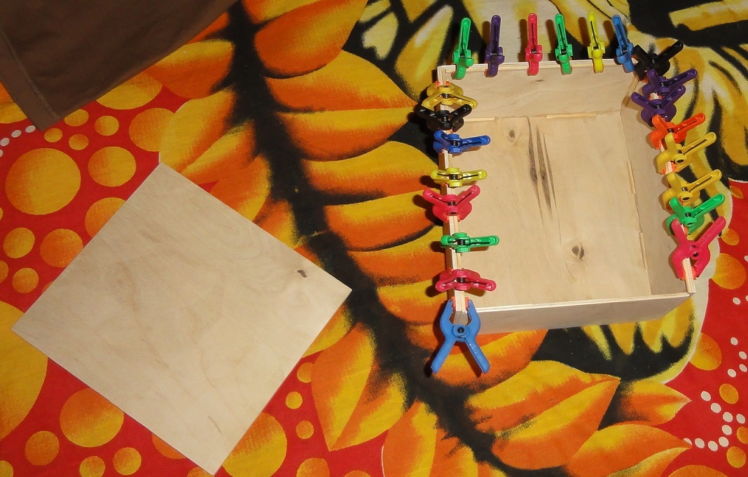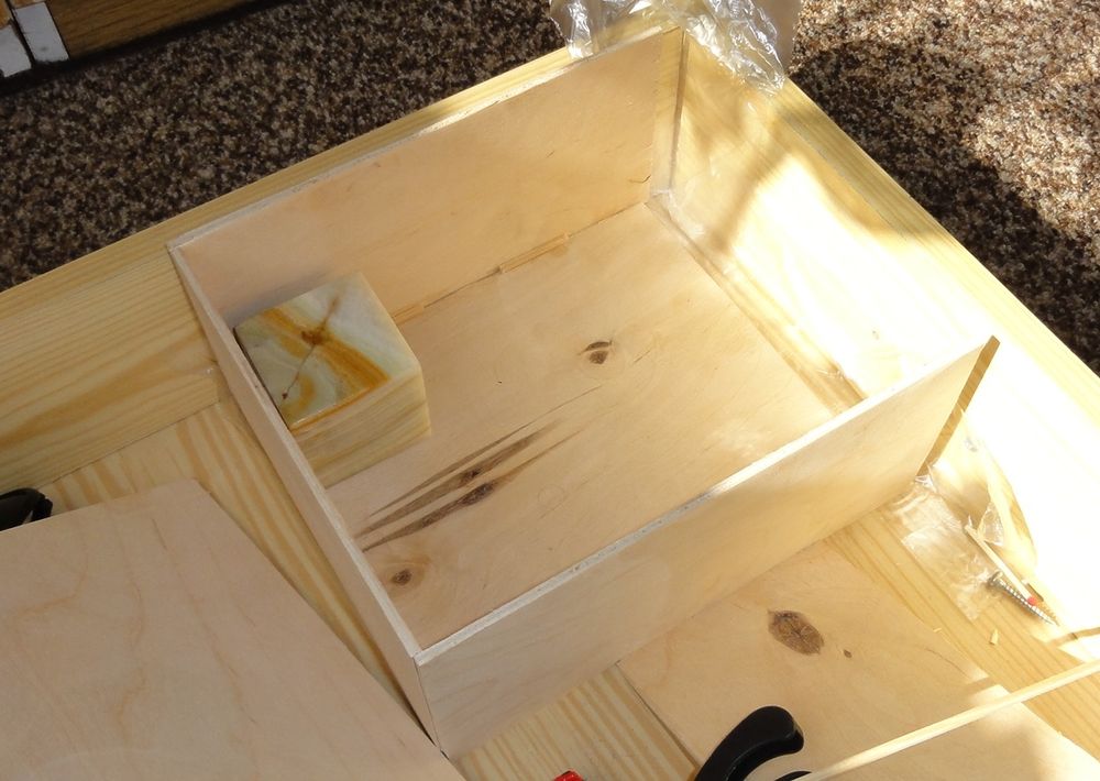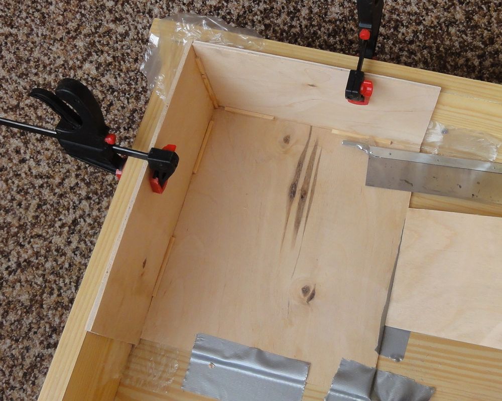 Dodatkowo dla wzmocnienia i zwiększenia powierzchni wkleiłem listewki sosnowe. Po wyschnięciu, obracam i wklejam kolejną ścianę: