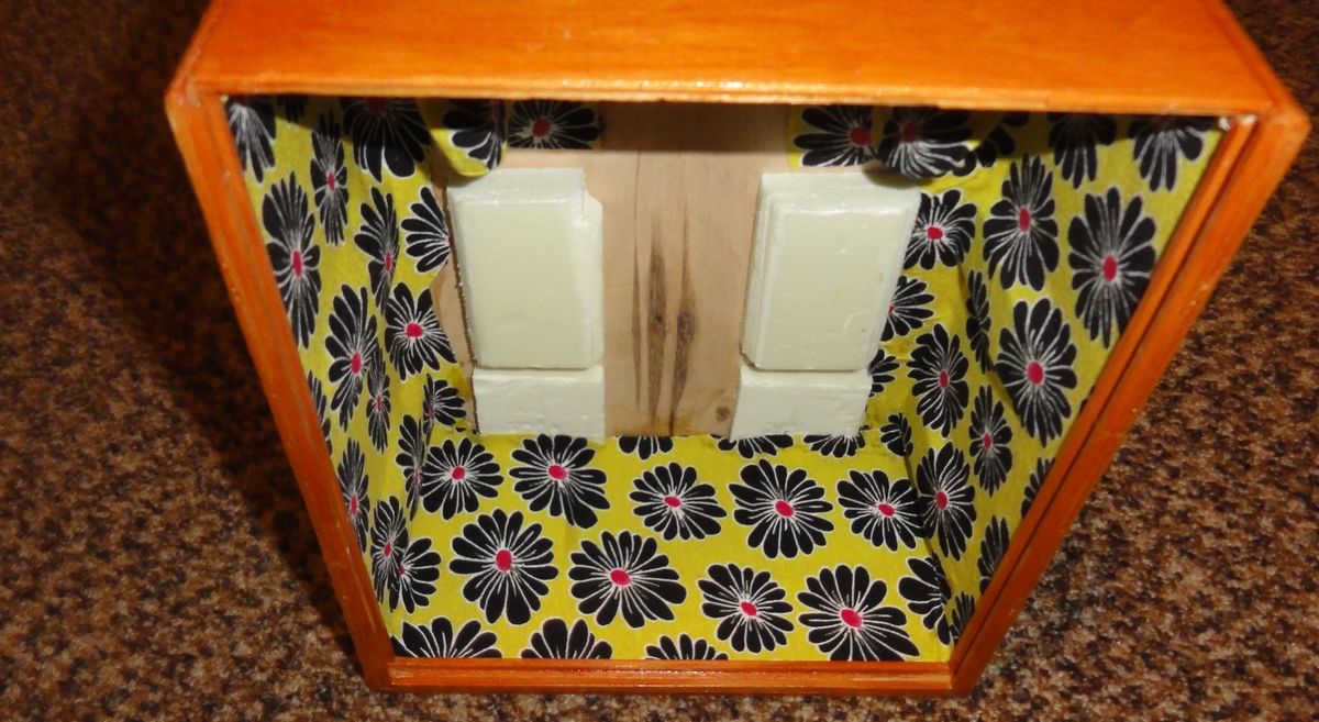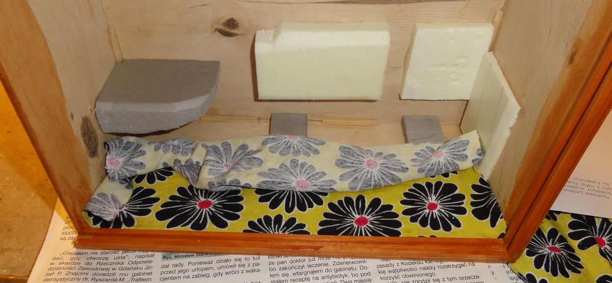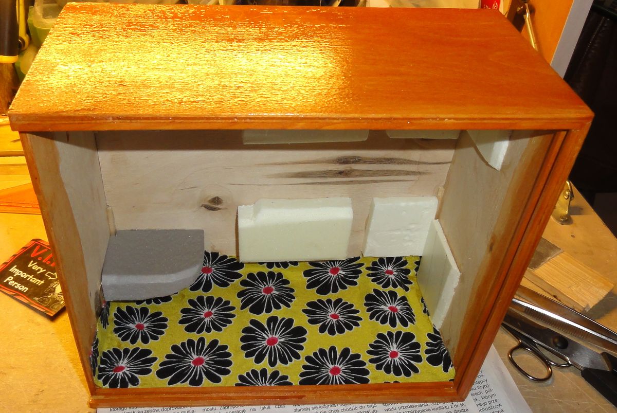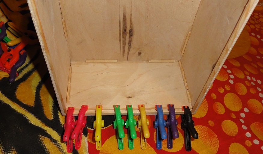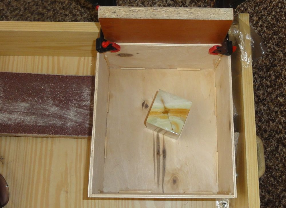 Dodatkowo dla wzmocnienia i zwiększenia powierzchni wkleiłem listewki sosnowe. Po wyschnięciu, obracam i wklejam kolejną ścianę: