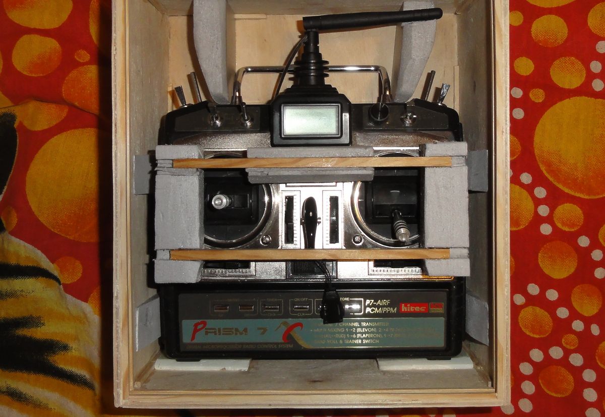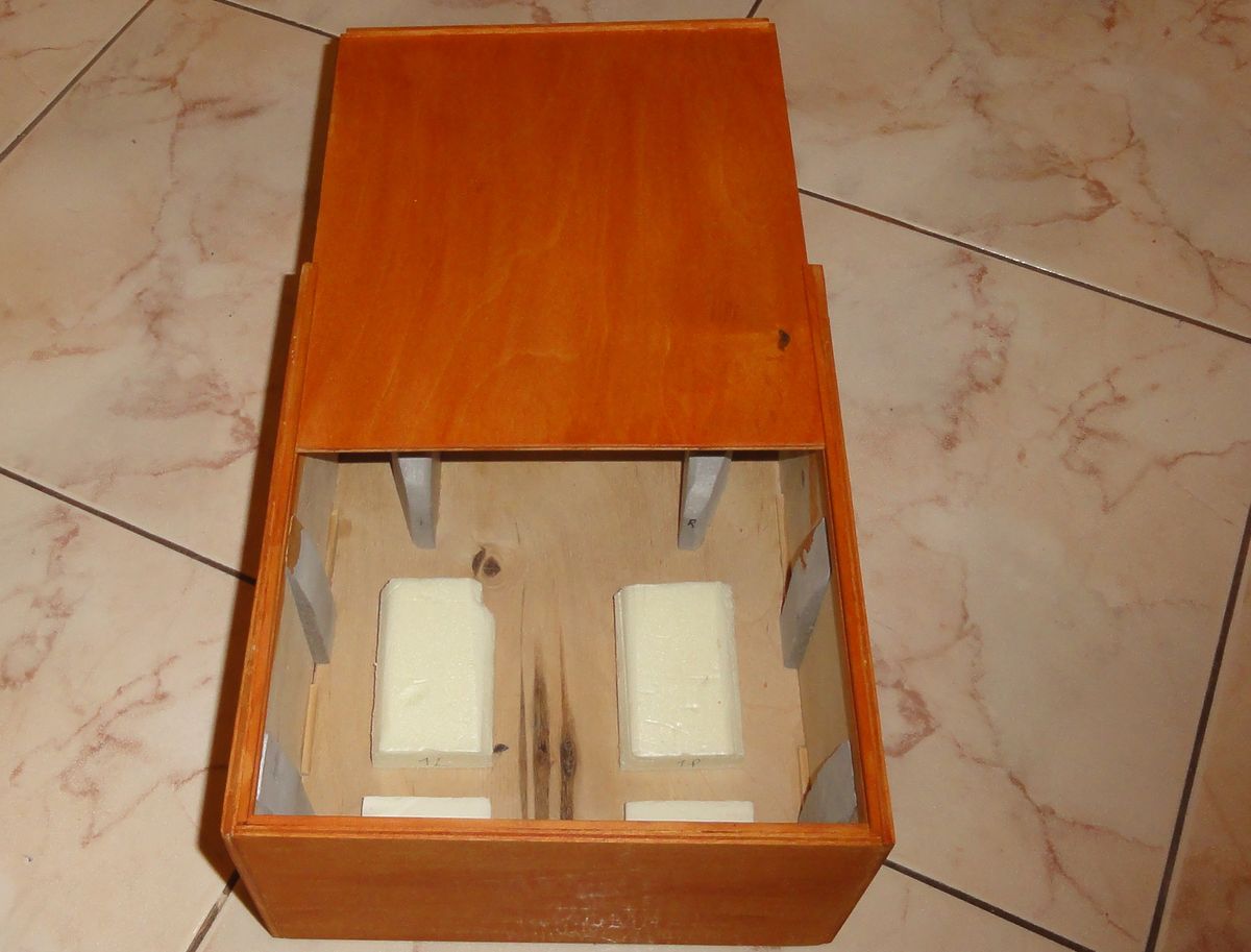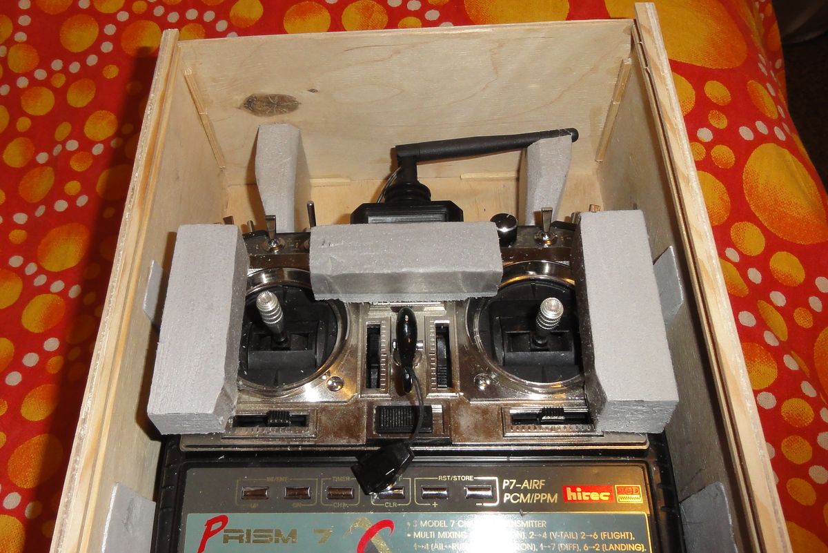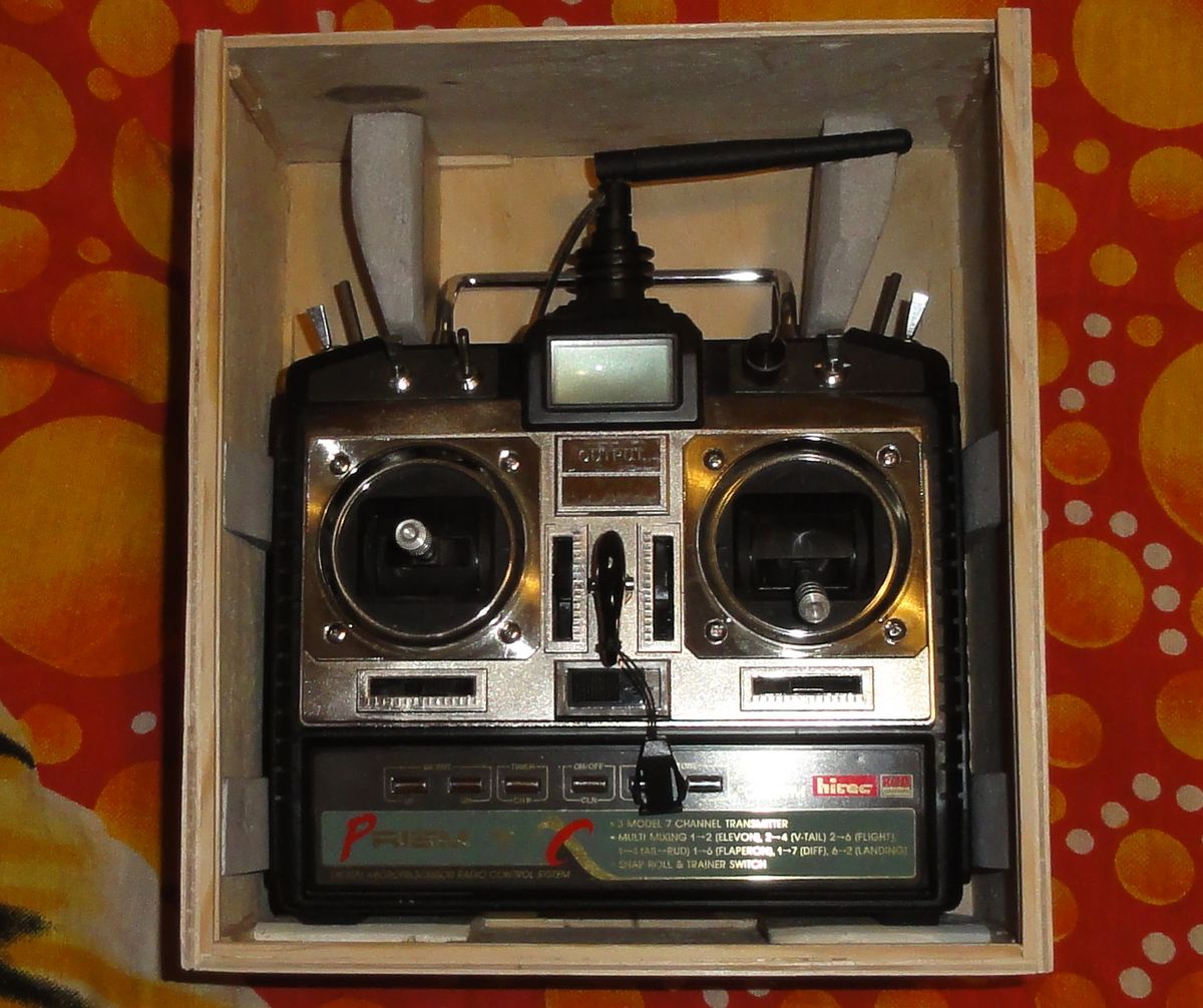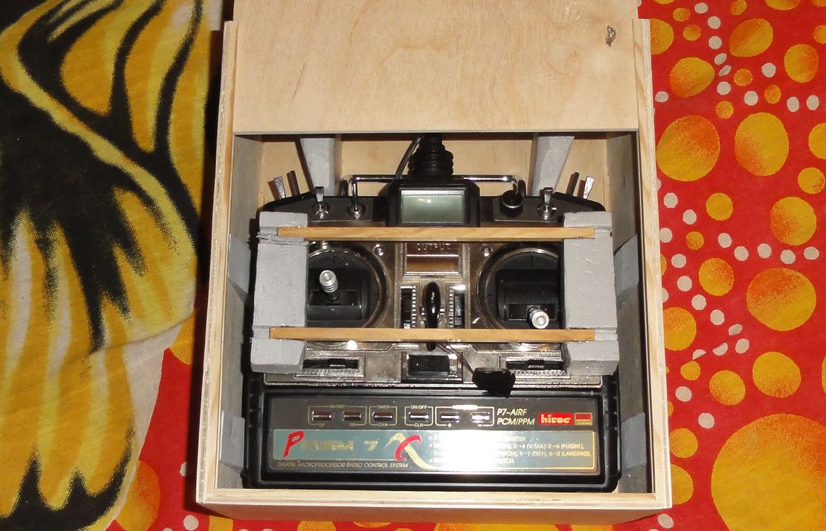 Podczas wyjazdów np. na lotnisko, zawsze muszę szczególną uwagę zwracać na nadajnik. Aby nic na nim się nie opierało, aby na drążki nic nie naciskało, aby przełączniki nie przestawiały się itp. Fabryczne pudło jest zbyt duże a wycięcie tylko górnej tylko części styropianu celem ochrony nie do końca mi pasuje. Można kupić gotowe skrzynki i zaadaptować je ale ja postanowiłem wykonać coś takiego od podstaw. Materiał - sklejka pochodząca z lat 80tych