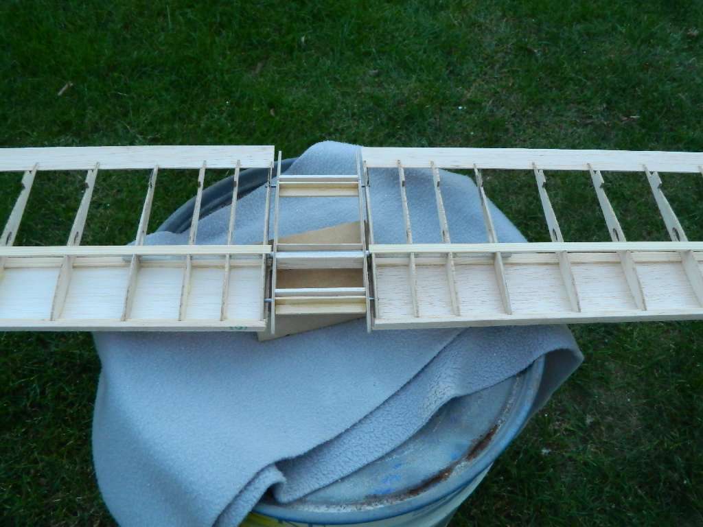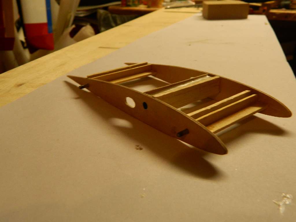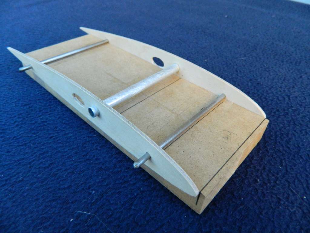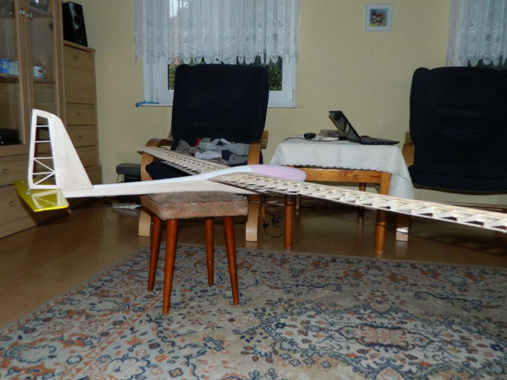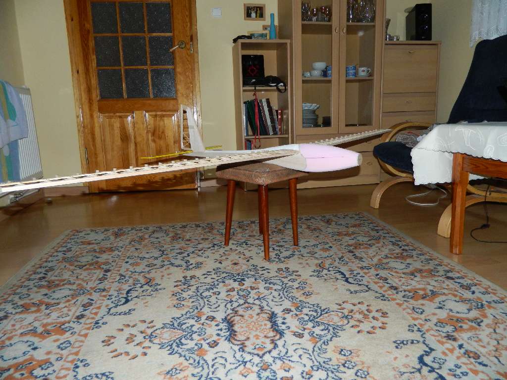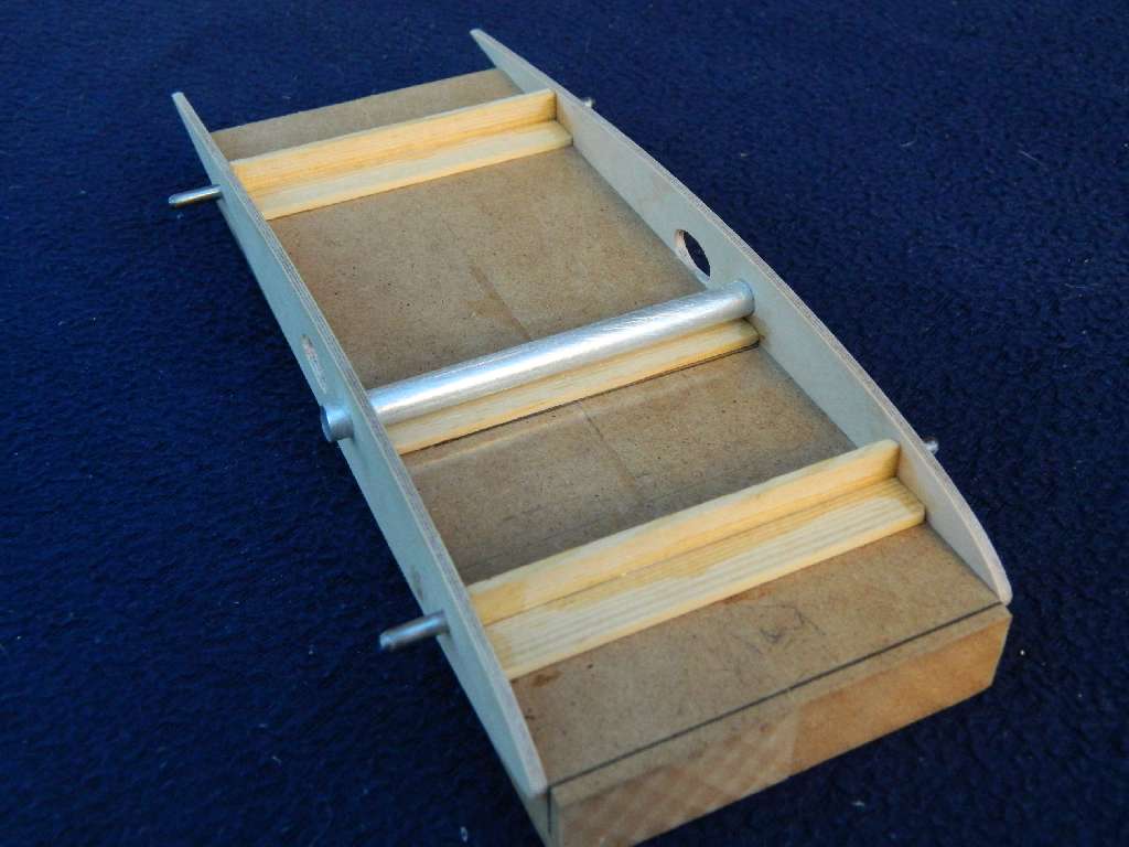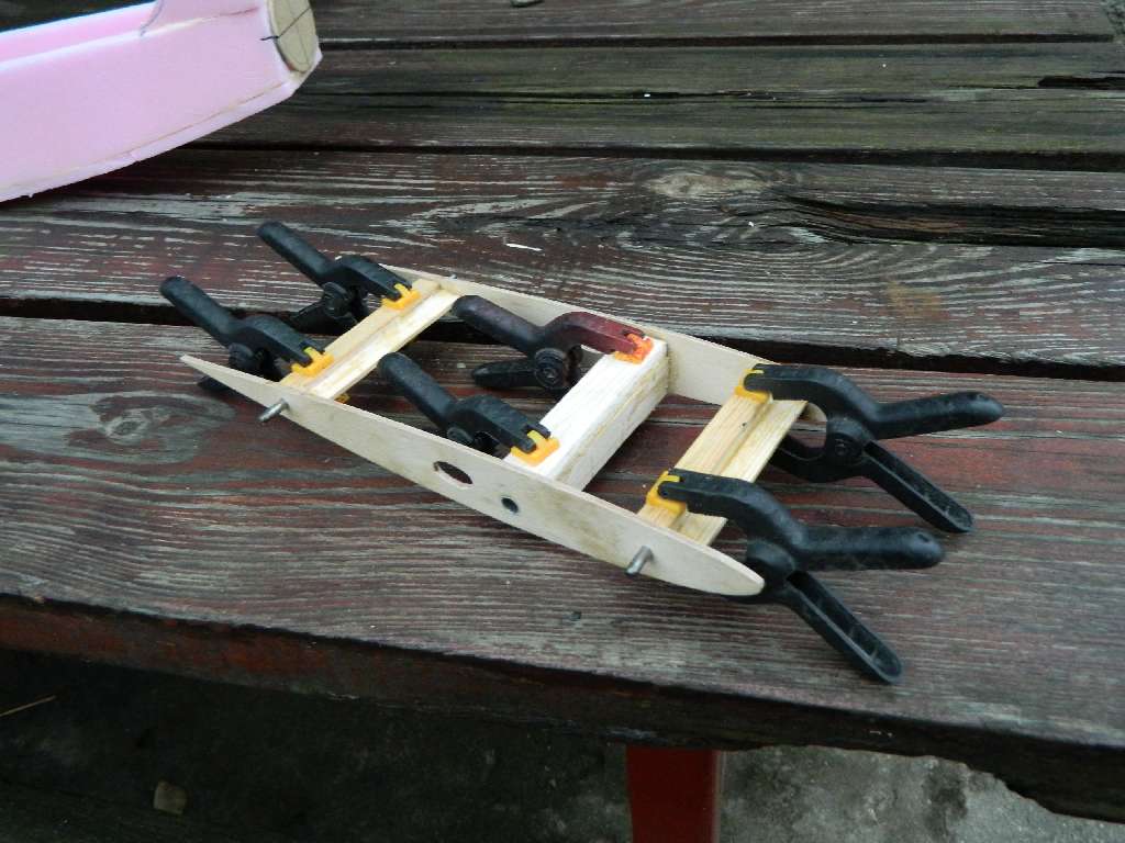 Centro zostalo zbudowane tak , aby dolna cześć prętów - kołków ustalających - była w jednej plaszczyźnie, jest to baza do wygenerowania kąta natarcia płata. Górna linia kadłuba jest linia zerową. Z moich wyliczeń wychodzi, że jezeli pod przedni kołek podkleję listwę 5 mm, a pod tylni 2 mm, kąt natarcia wyniesie ok 1,5-1,6 st. Tak tez zrobiłem....pod oba kołki podkleiłem listwę sosnową, przód 5 mm, tył 2 mm, szerokość listwy 8 mm. Równocześnie pod podłużnice sosnowe 3x3 mm w kadłubie wkleiłem listwy sosnowe 10x3 mm, a na nie 8x3....zrobiłem to w miejscach styku listew z centro z kadłubem. W tych miejscach będzie centro połączone z kadłubem. Pod rurka łącznika wklejona balsa, twarda 5 mmm i będzie doszlifowana do jednej płaszczyzny z listwami sosnowymi....w centro. Ta metoda umozliwia dowolną konfigurację kadłub-profil plata w ADW-1 i tyczy się wszystkich wersji, jest to stabilne, mocne i wielokrotnie sprawdzone w moich modelach rozwiązanie.