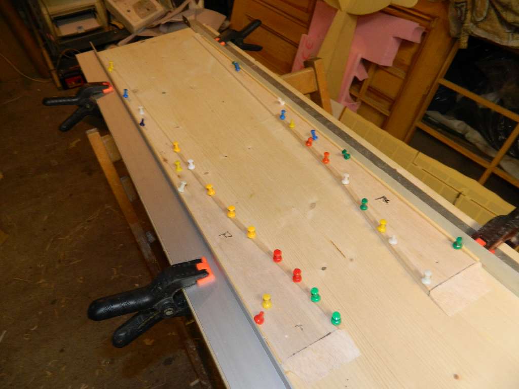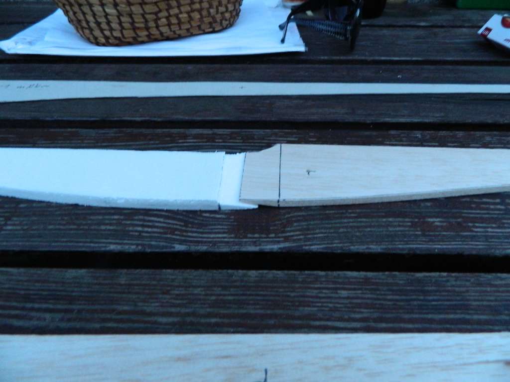 Po wewnętrznej stronie balsowych boków kadłuba przykleiłem na górnej krawędzi listewke sosnową 3x3, na calej długości krawędzi. Na dolnej tak do połowy boku , listwę balsową 4x4, która będzie zeszlifowana na trójkątny przekrój, ale to za jakiś czas.