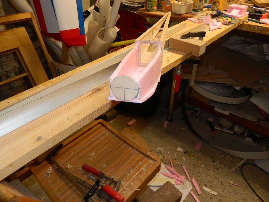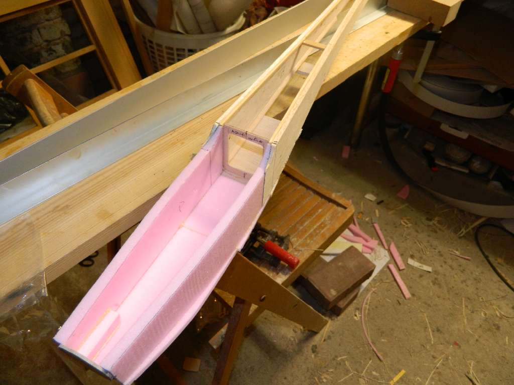 Boki kadłuba wycięte z balsy 5 mm. Część kabinowa będzie zrobiona ze styropianu , oszlifowana razem z resztą kadłuba i zalaminowana z zewnątrz, a po wypłukaniu od wewnątrz. Taką metodę zastosowalem w ADW-1 M, ale w ograniczonej formie. Na zdjęciach widać zfazowane boczki kadłuba i części kabinowej. Wszystko wyjaśni sie w trakcie mojej relacji.