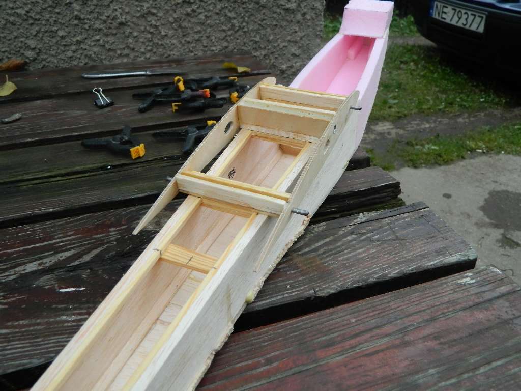 Kadłub złozony. Musiałem zastępić styropian styrodurem, ma większą sztywność. Wręga ze sklejki 2 mm, tak samo jak wręga z przodu kadłuba, narazie pełna, później zostanie w niej zrobiony otwór i będzie to podstawa do przyklejenia wręgi silnikowej. Następnym etapem będzie dokończenie oklejania spodu kadłuba - balsa 5 mm - i przyklejenie wcześniej zrobionego centro.