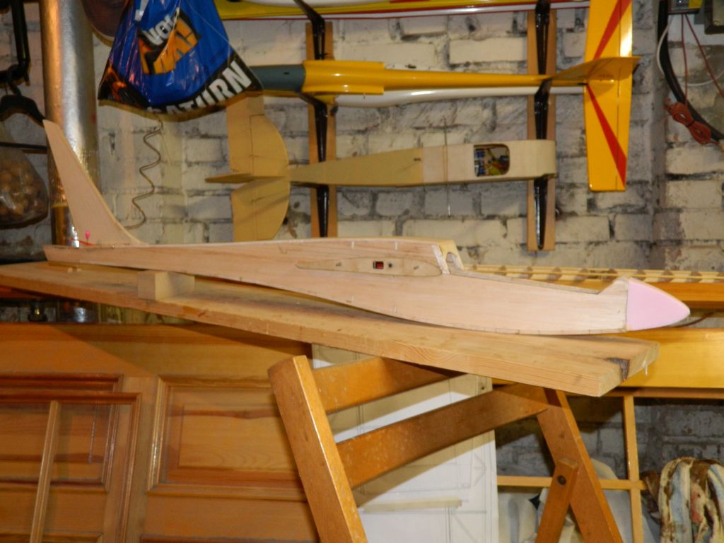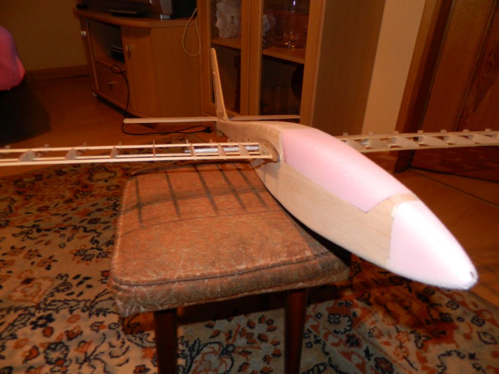 Rozpoczynam obróbkę kadłuba razem z owiewką kabiny ;) krawędzie trochę zaokrągliłem, przykleiłem płozę, to co widać to dość wstępny widok. Trzeba jeszcze popracować kostką z papierem, podszlifować tu i tam ;) . Na tak wyszlifowany kadłub przyjdzie warstwa tkaniny, szpachlówka .....opisywałem to już kilka razy :). Przymiarka z drugimi płatami - SD7037.