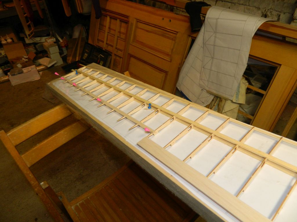 Edit: Wkleiłem drugą listwę dźwigara oraz spływ z balsy 1,5x25. Przyłożona i zaraz będzie przyklejona dolna listwa - 1,5x8 mm - dźwigarka przylotkowego. To wszystko w celu ustabilizowania żeberek.