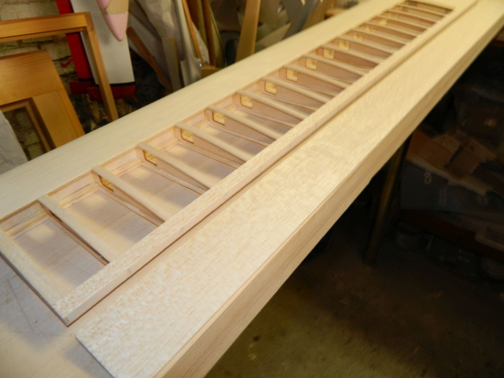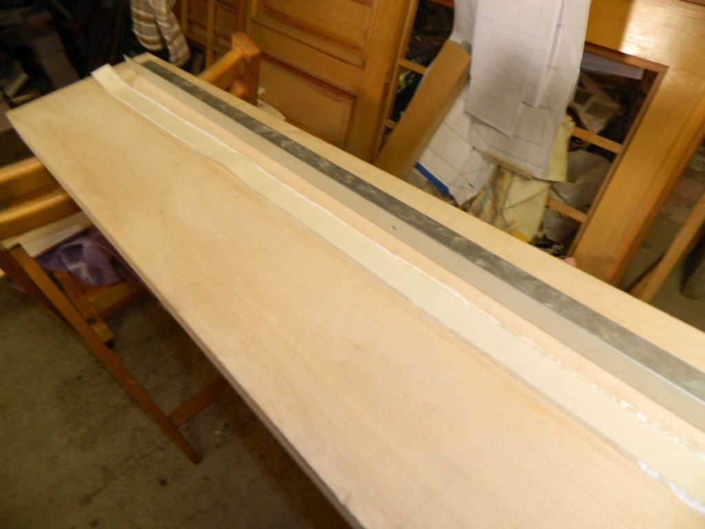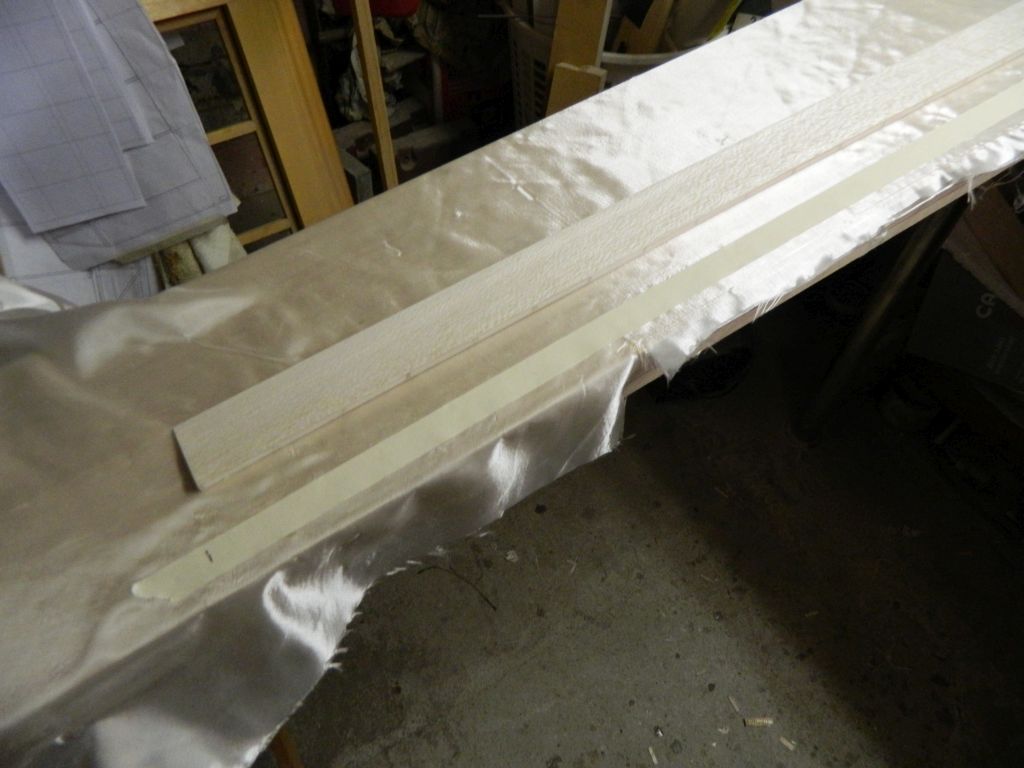 Lotka została odcięta, przestrzenie między listwami balsowymi wypełniłem balsą, oszlifowałem i postanowiłem krawędzie przelaminować cienką tkaniną /48 g/m^2/. Mając w głowie doświadczenia z tą operacją w Amoku, tam mi się totalnie poplątały wąskie paski tkaniny przesączonej żywicą, wymyśliłem(?) taki oto sposób.