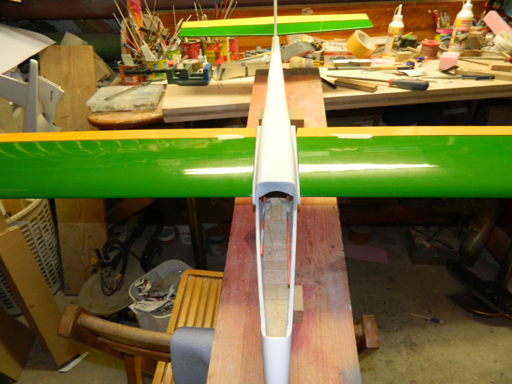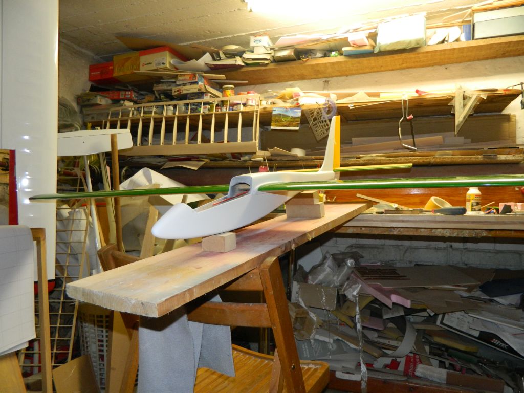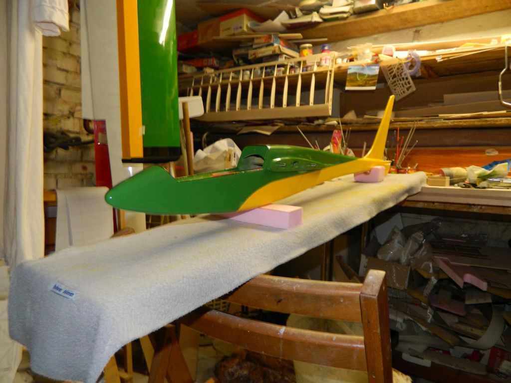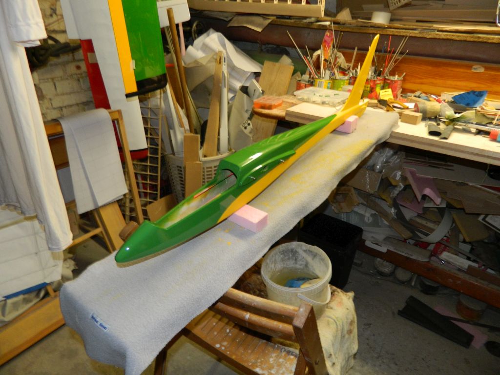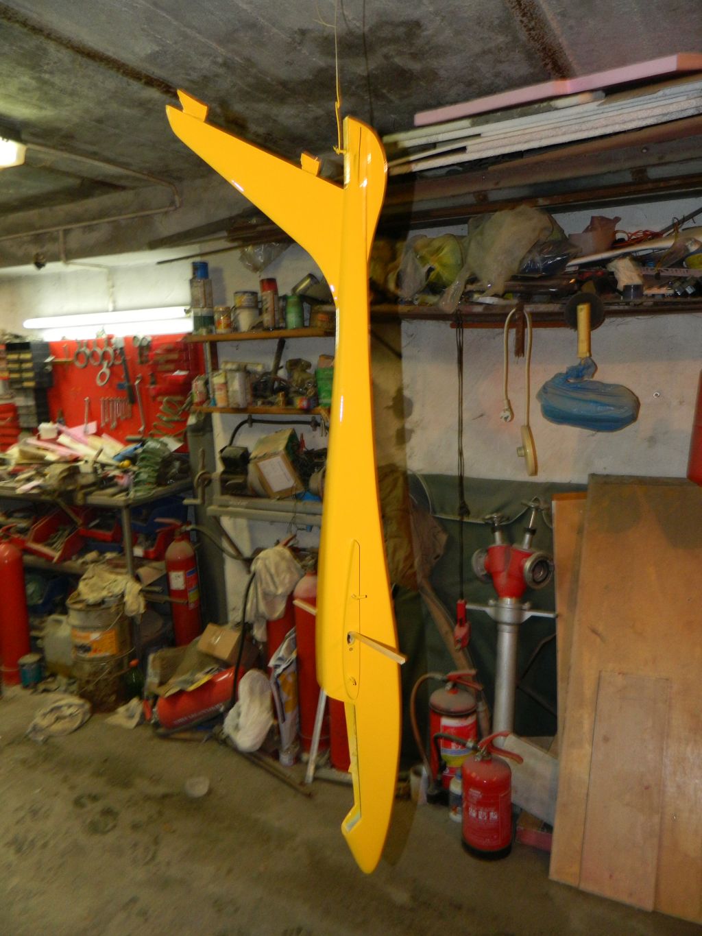 Niepowodzeń ciąg dalszy ;) Położyłem dzisiaj ostateczną warstwę podkładu białego pod lakier i podczas przenoszenia kadłuba z garażu do piwnicy, uderzyłem o coś....efekt, wgniecenie w tylnej części kadłuba, na przodzie i sama końcówka pionu :x , chyba jakieś fatum wisi nad modelem. Ale wszystko zaszpachlowałem, myślę , że jutro albo pojutrze trysnę lakierem, na razie na żółto.