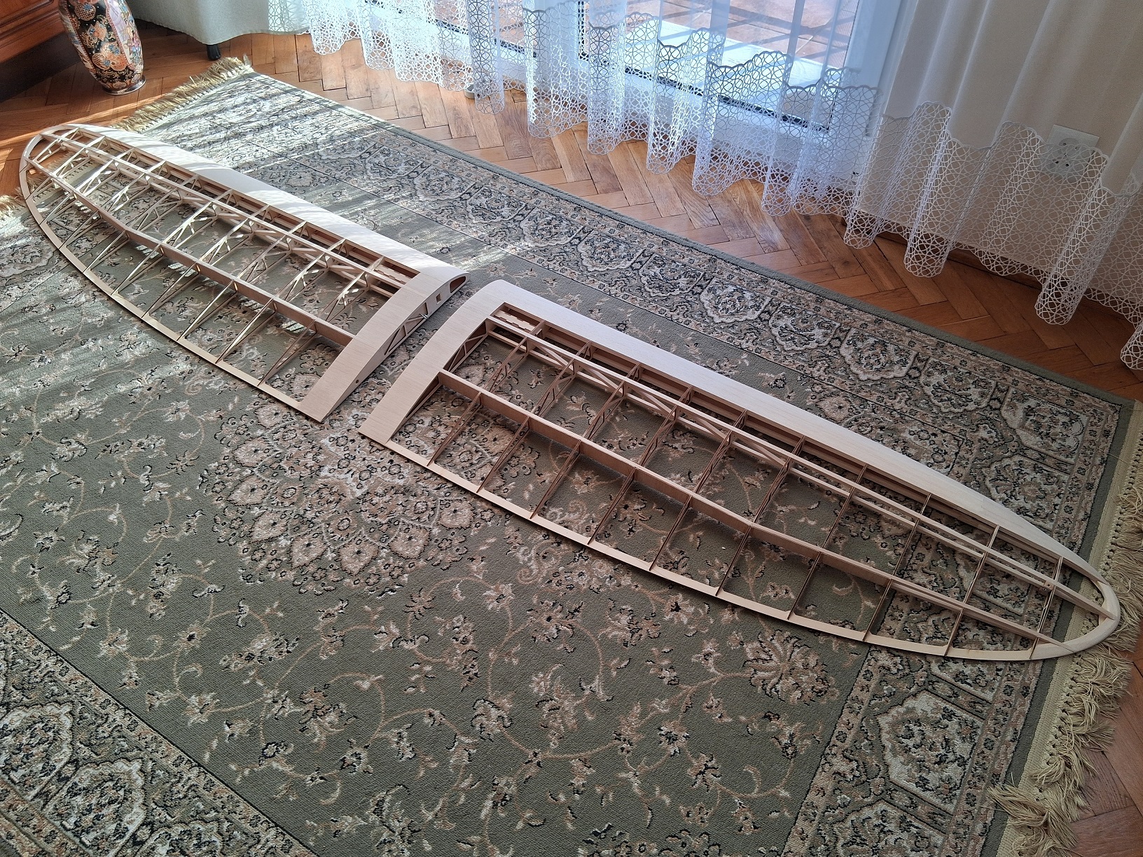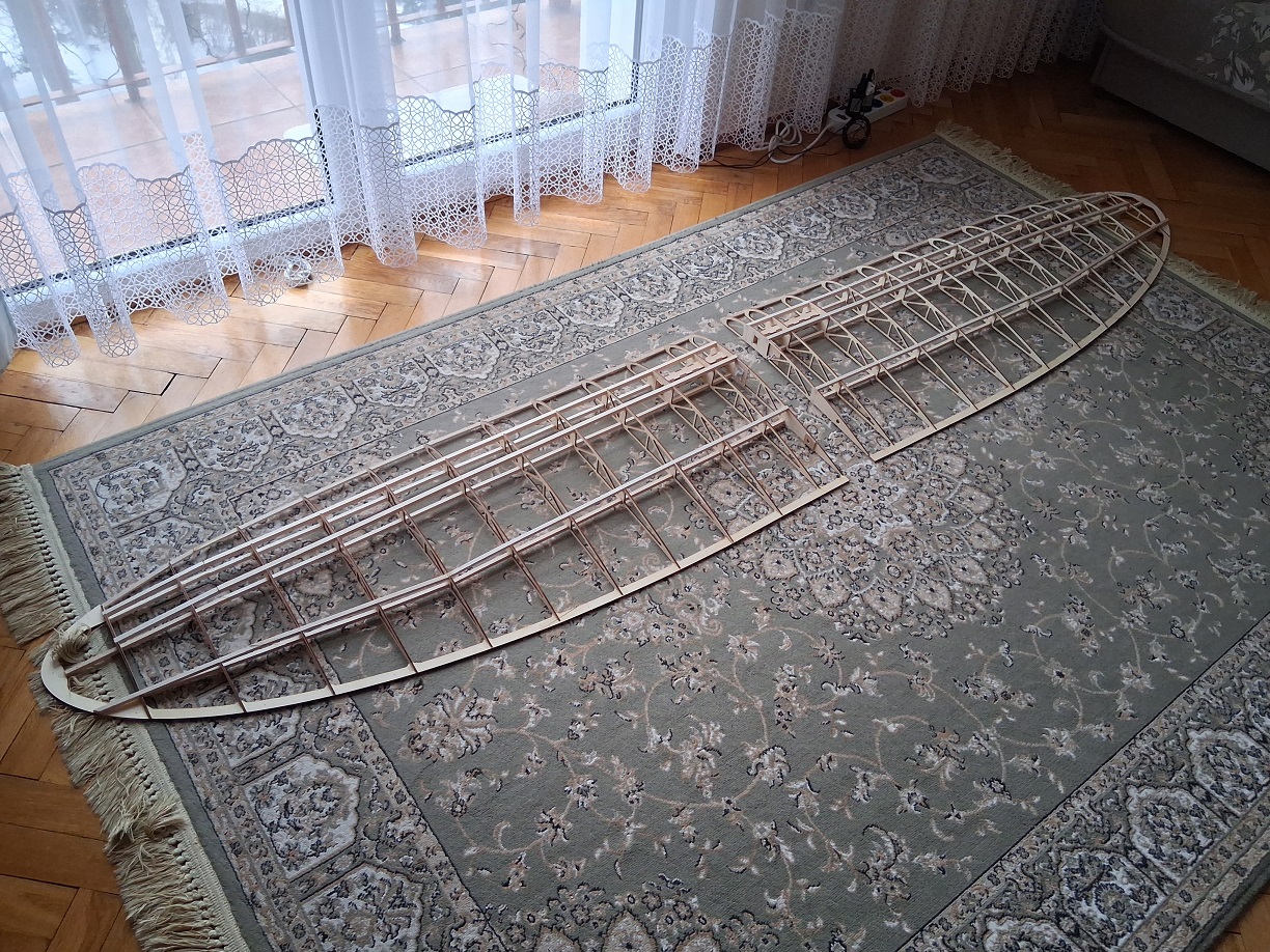 Wykorzystałem trochę wolnego (akurat wnuki pojechały na trzydniową wycieczkę z rodzicami) i skleiłem skrzydła. Wymagają jeszcze zabudowania kesonów i dopieszczenia. Kawał powierzchni nośnej!