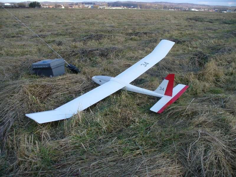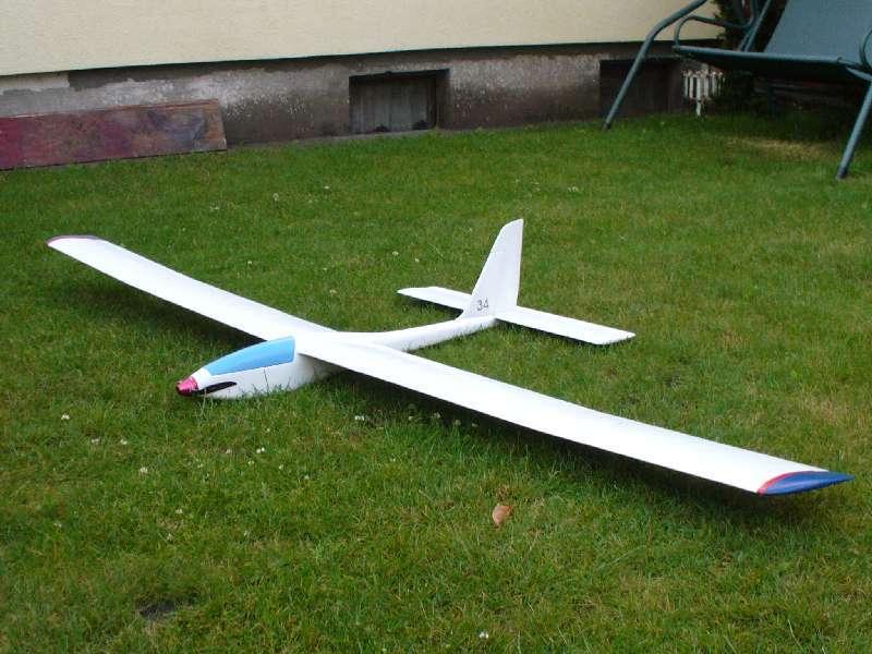 Wiedziałem, że nie uniknę motoryzowania moich szybowców, tak jak pokrywania ich folią. Robiąc zakupy w HK dla moich synów - pasjonują się ASG - dorzuciłem do zamówienia silnik elektryczny, lipola, regulator. "34" był właśnie po poważnej kraksie, wbił się w ziemię. Uszkodzone były oba płaty, pęknięte kesony, popękany przód kadłuba. Decyzja jedyna możliwa. Przeróbka na motoszybowiec. Płaty wydłużone 115 cm - nowe końcówki, oczywiście z lotkami. Teraz "34" ma 240 cm rozpiętości, silnik Turnigy 2830 1050 kV, kołpak turbo 40 mm, łopatki 10x6, latam na pakiecie 3s 2,2Ah. Waga do lotu 1300 g.