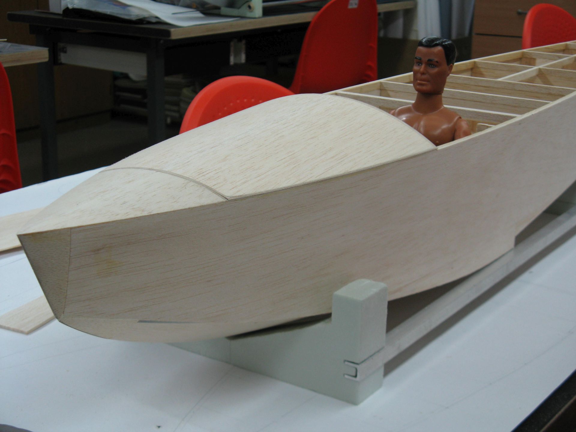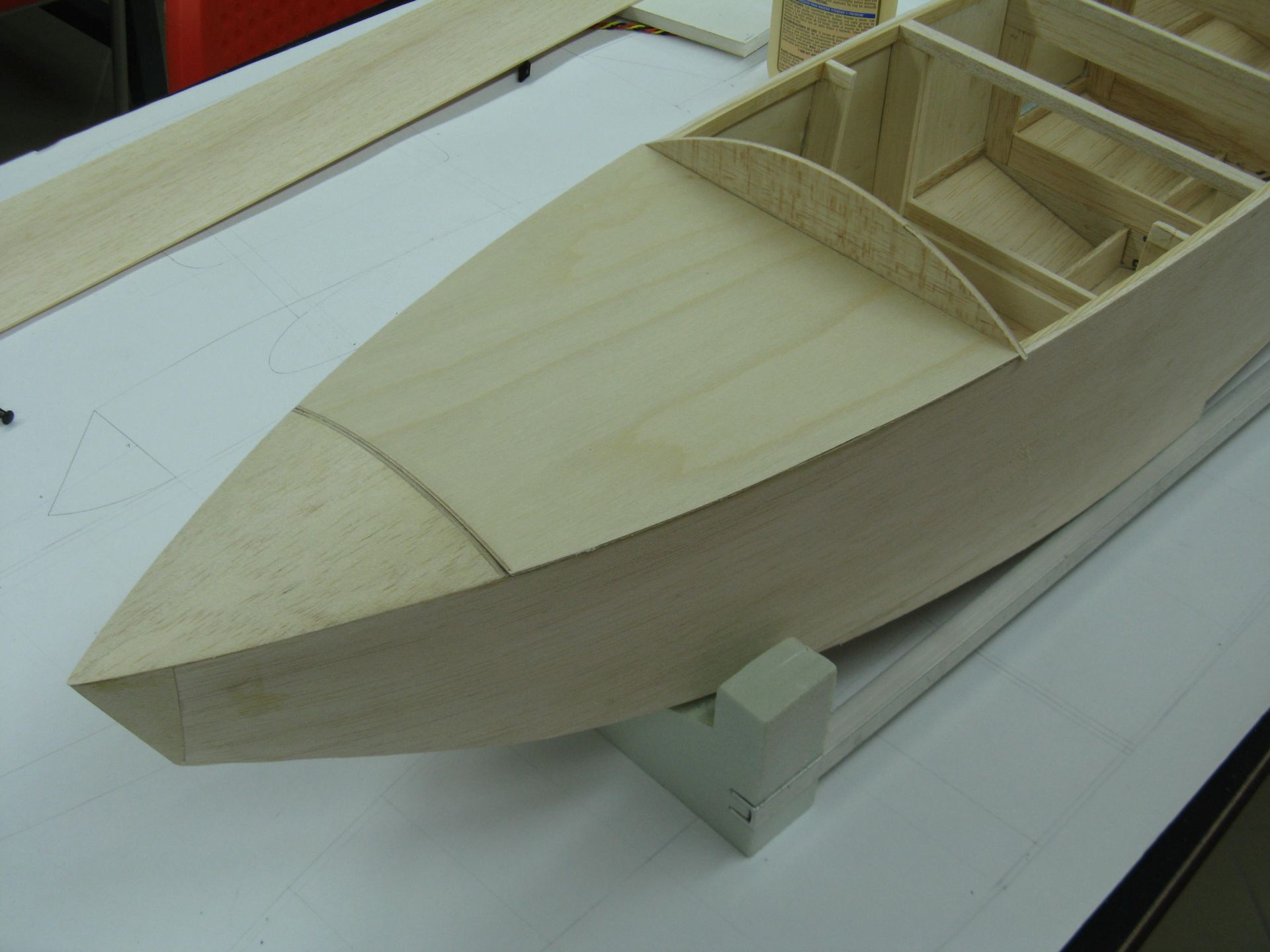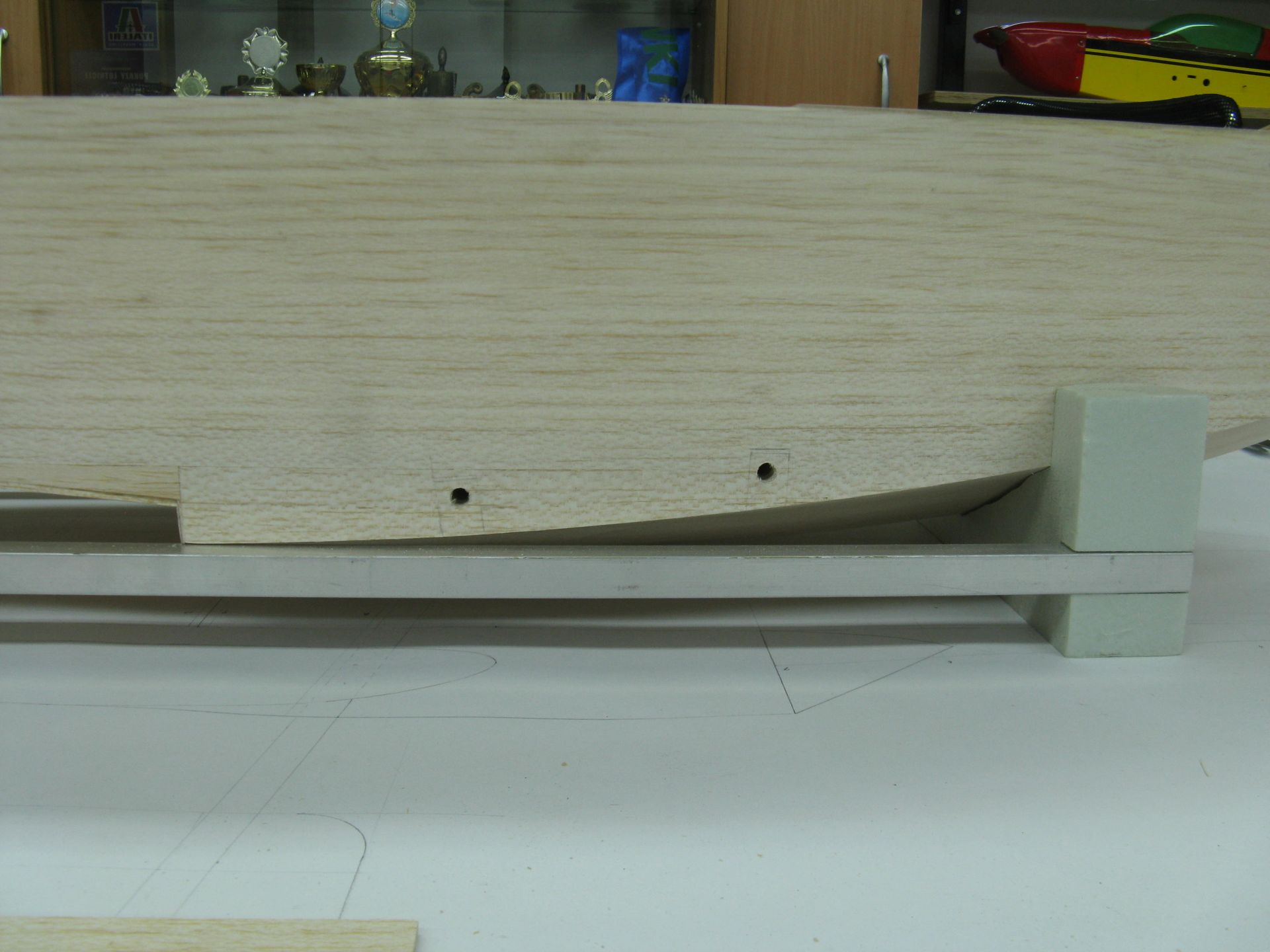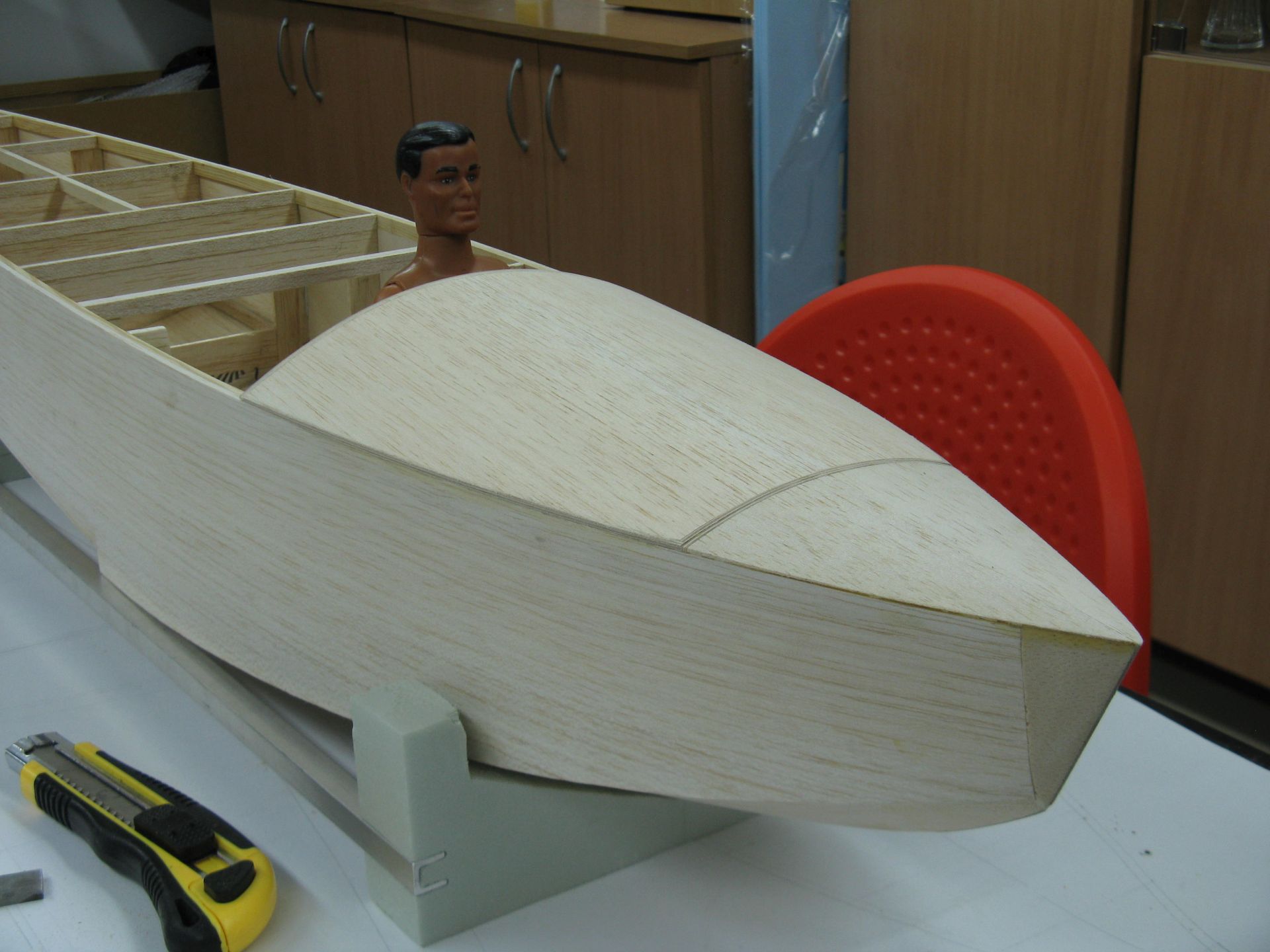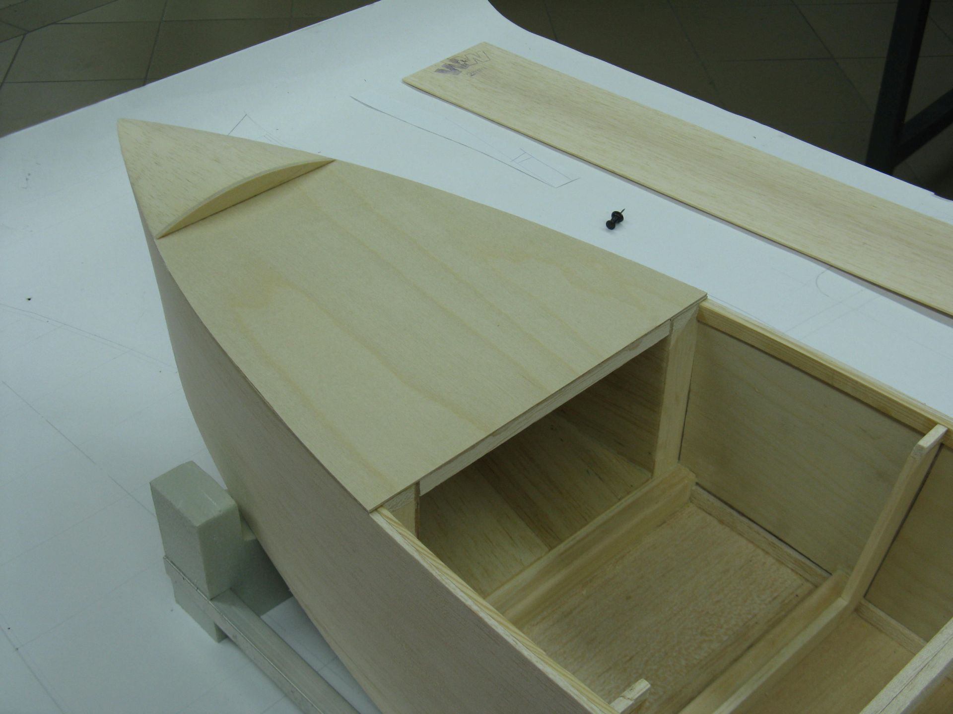 Klapkę z przodu podnoszoną w celu dostępu do akumulatora zrobiłem ze sklejki 1mm (podstawa) i żeberek balsowych 2mm. Na to pokrycie z twardej balsy 2mm.