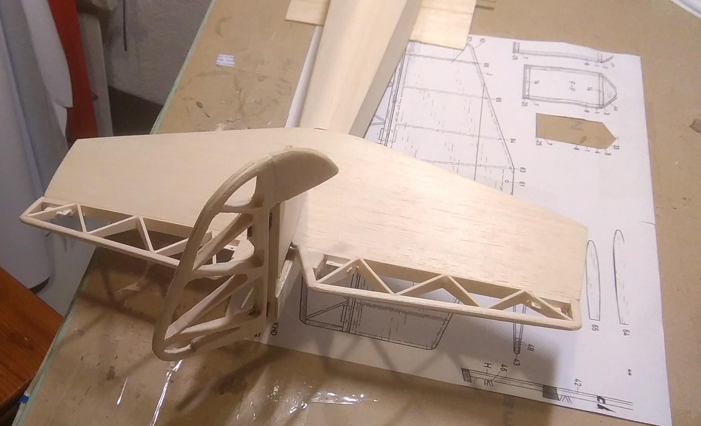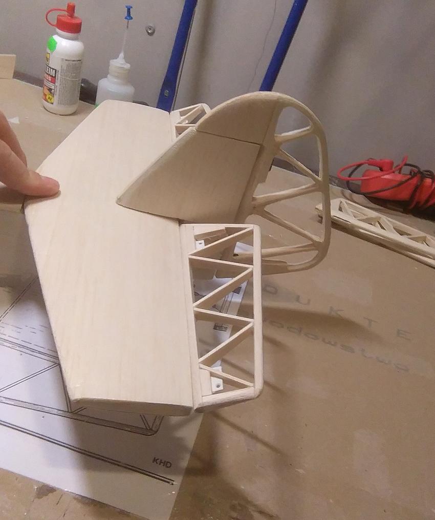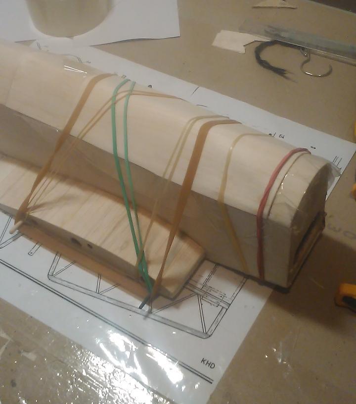 Zeszlifowałem sosnowe listwy biegnące wzdłuż klapki w trójkąt i przykleiłem poszycie do klapki, niestety przód klapki uniósł się trochę do góry. Będę to jeszcze próbował uratować.... Zrobiłem otwory na kabinki. Dorobię jeszcze magnesy do klapki i trzeba będzie brać się za maskę...