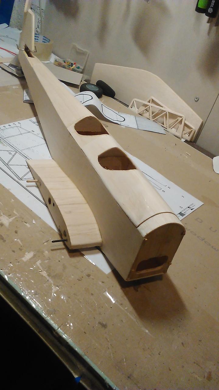 Pierwsze przymiarki, zaczyna mi się podobać. Mimo naklejania szablonów wręg na balsę musiałem podkleić 2 tylne wręgi, ponieważ wyszły krzywo . Bowdeny zamontowane, serwa podobnie więc powoli idzie. Muszę jeszcze coś zrobić z tą dziurą między statecznikiem poziomym a pionowym bo nie będę latał dziurawym samolotem :P