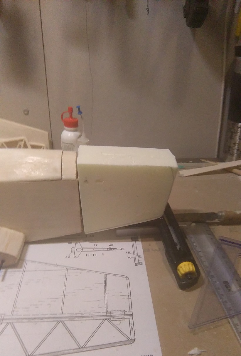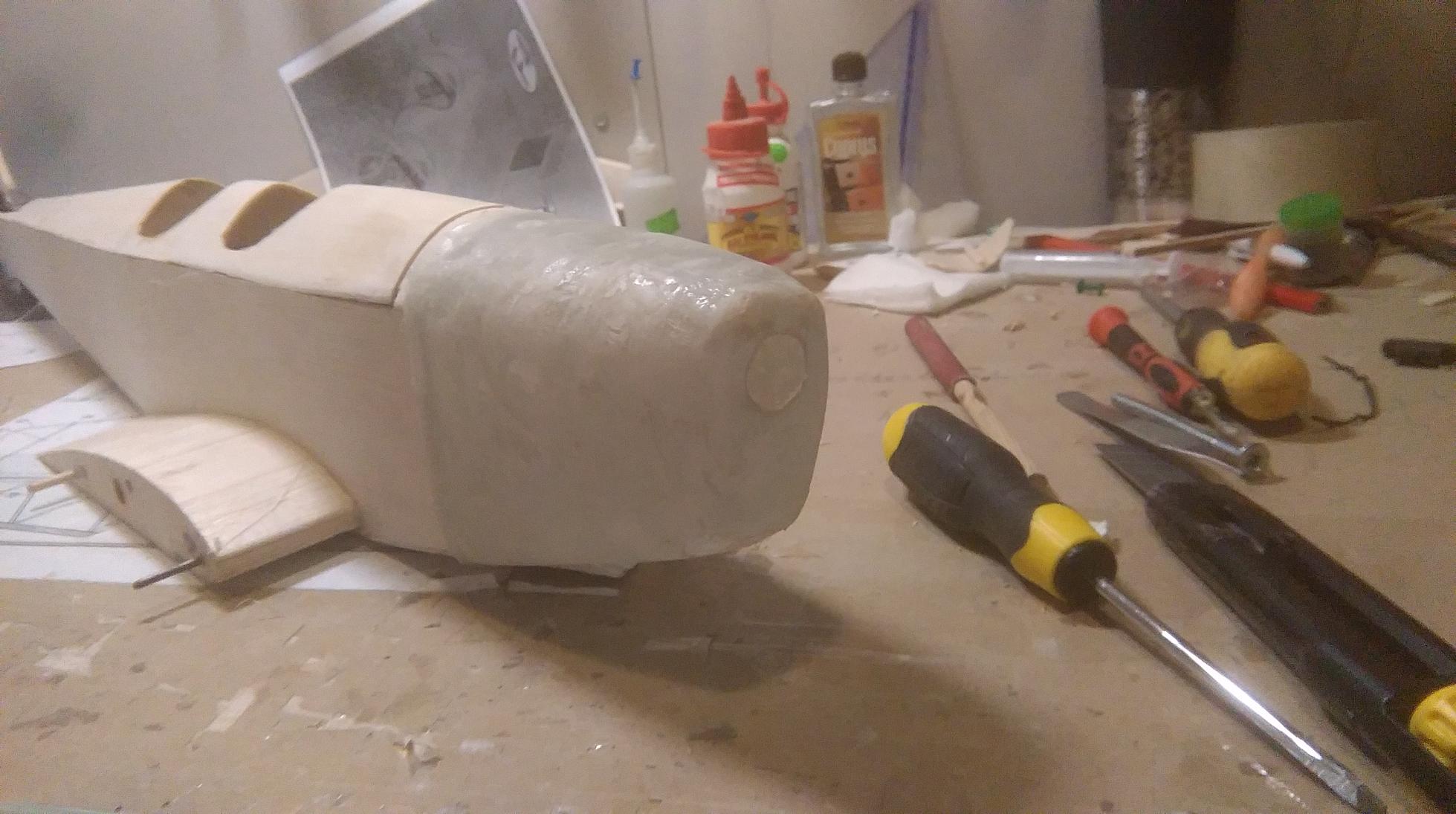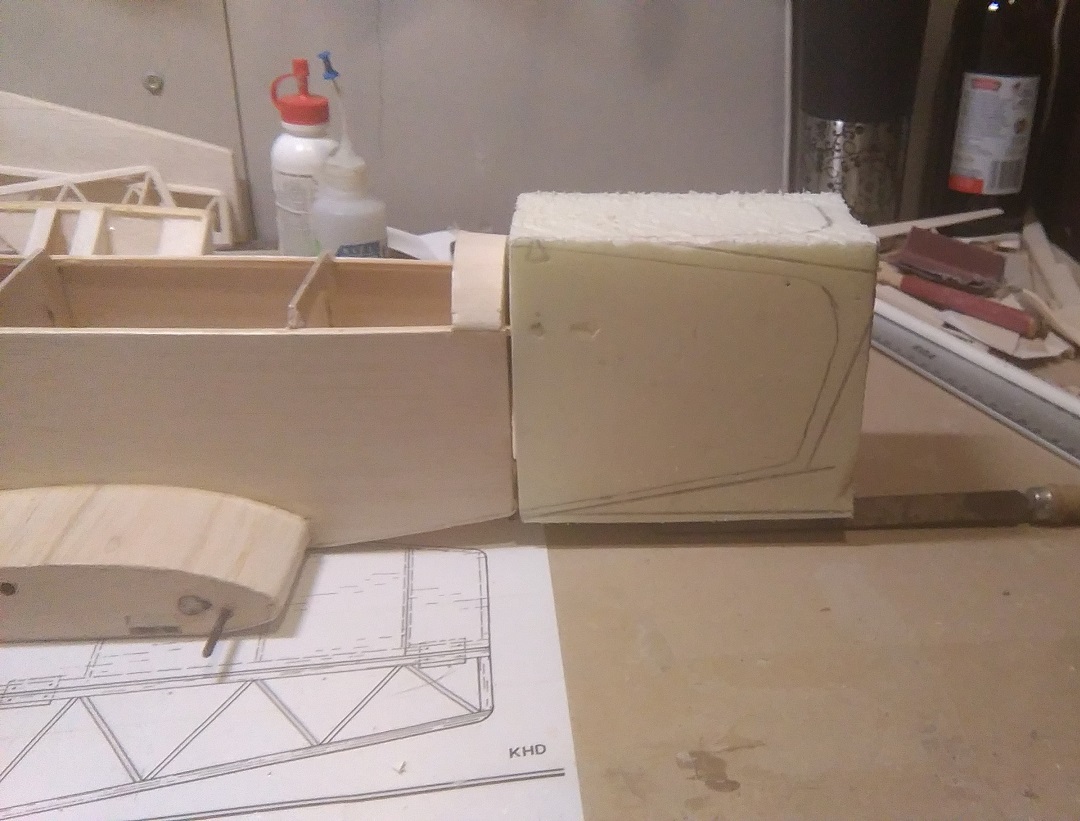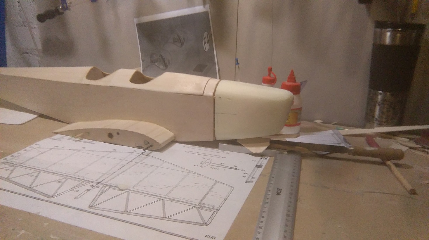 Zabudowałem trochę górę kadłuba przy silniku - żeby było na co nasunąć maskę silnika. Kadłub zabudowałem też trochę z tyłu, w miejscu gdzie będzie 2-ga kabina pilota. Pierwotnie planowałem zrobić ją demontowalną, ale mam dostęp do serw i tak długa klapka będzie zbędna.