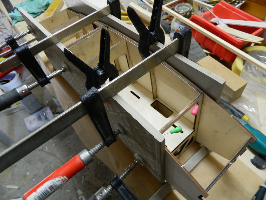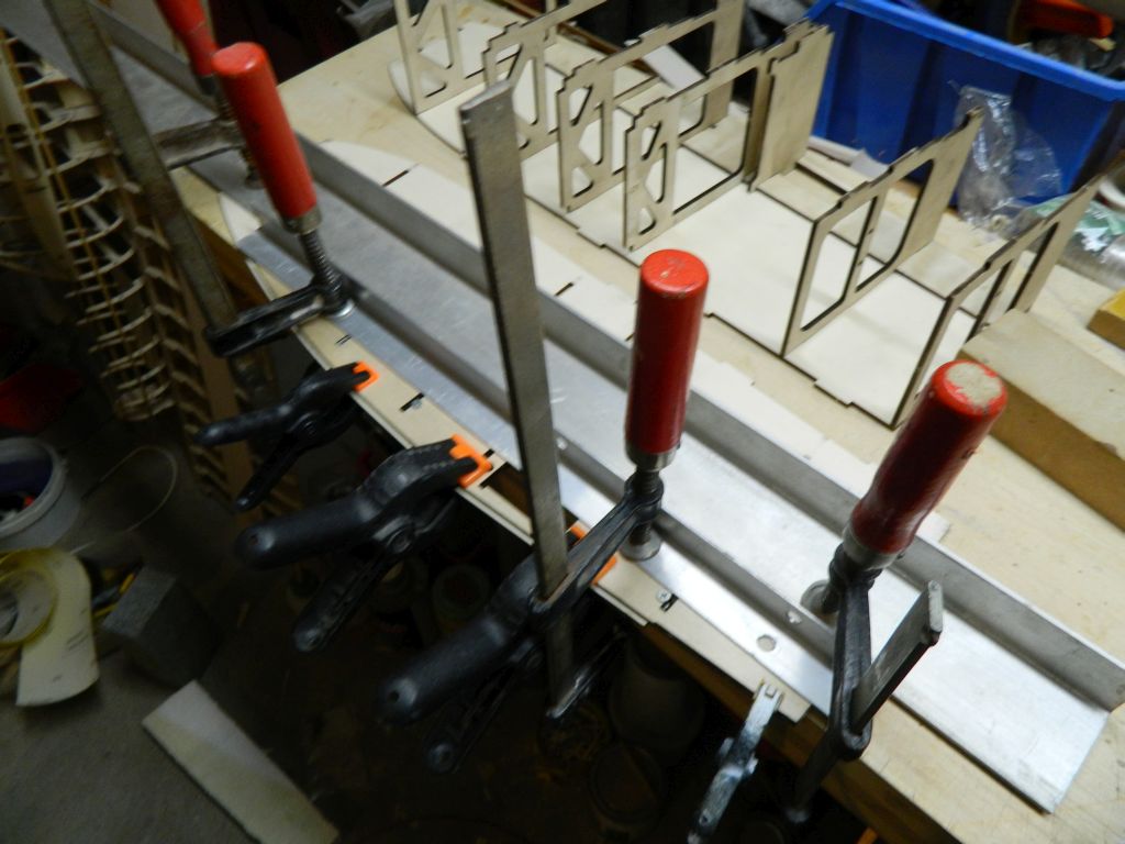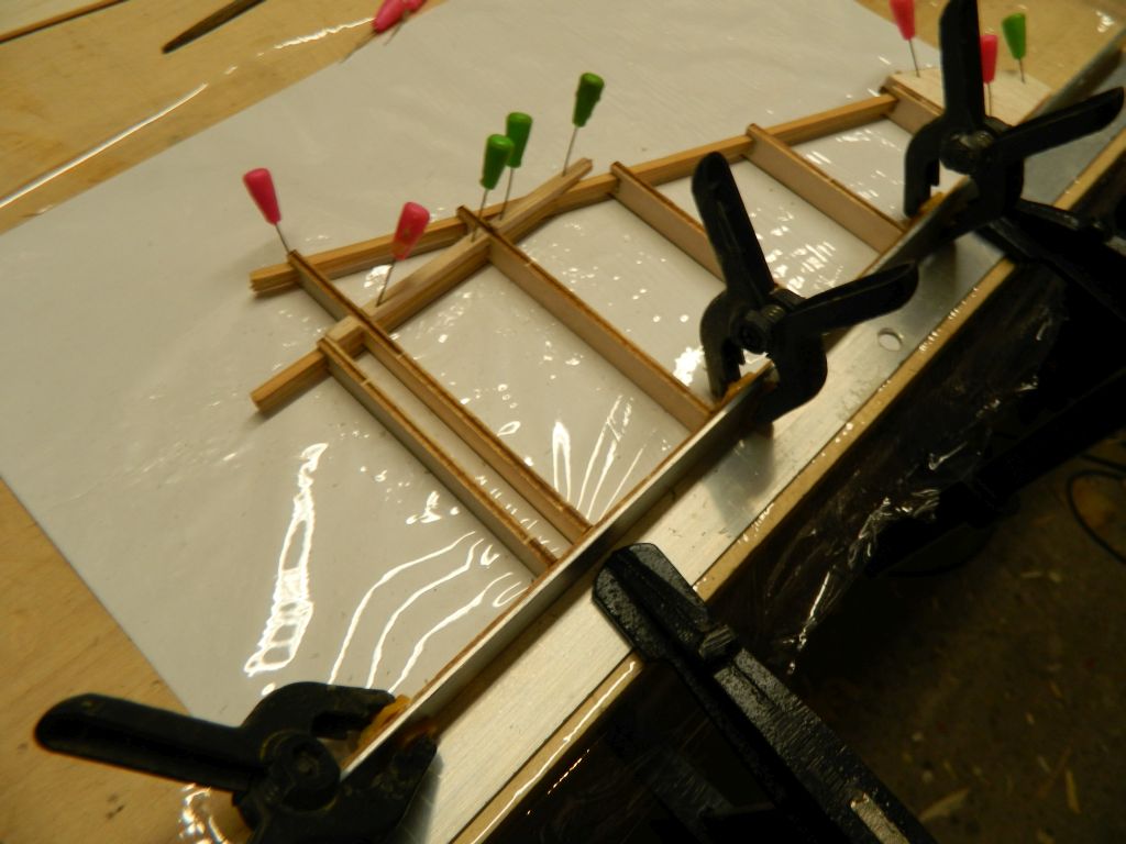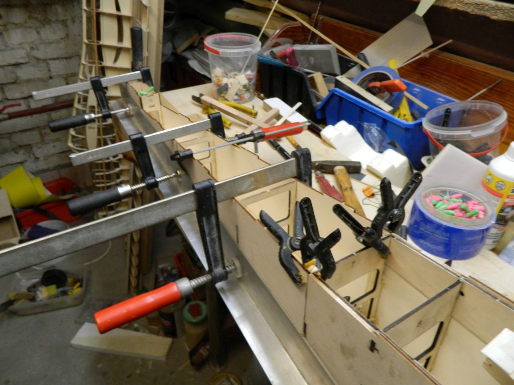 Długo zastanawiałem się jak skleić kadłub. Przede wszystkim klej musi mieć długi czas aplikacji. Wybór był prosty - klej poliuretanowy. Na początek wkleiłem wręgi w jeden z boków przedniej części kadłuba. Następnie drugi. Wykorzystałem półkę pod pakiet/serwa jako element stabilizujący, nie przyklejałem go. Podobnie jak wręgi silnikowej - jej wklejenie uniemożliwi zamocowanie później półki. Między wręgami 2-6 u dołu tam gdzie są wpusty we wręgach, wkleiłem listwę sosnową 5x5. Wszystko ustabilizowałem i skręciłem ściskami. Po wyschnięciu między wręgi 5/5.1 od spodu wkleiłem listwę 8x8. Następnie to pudełko skleiłem z dolnym poszyciem kadłuba.