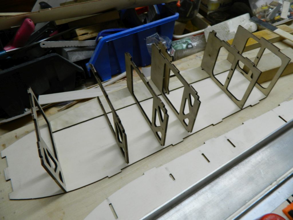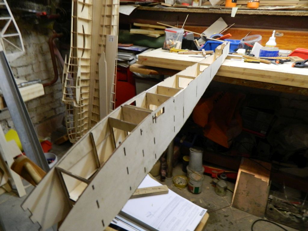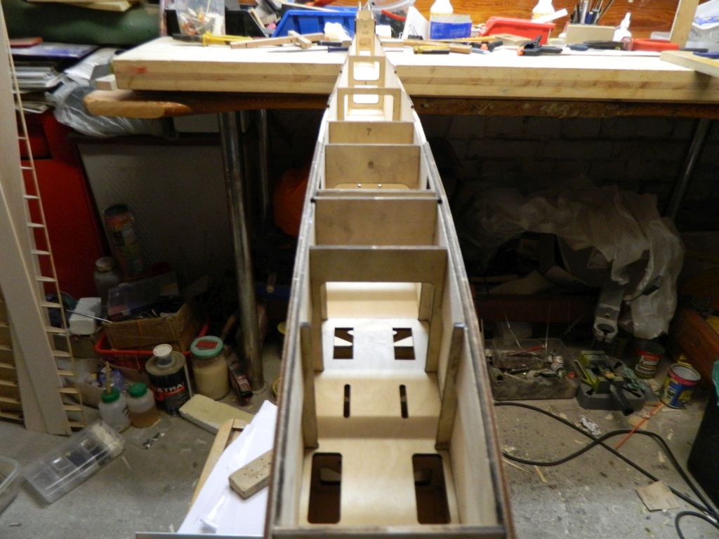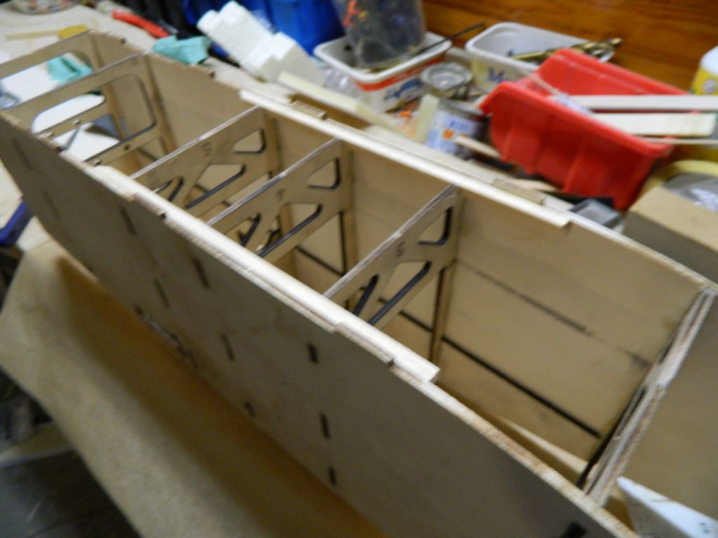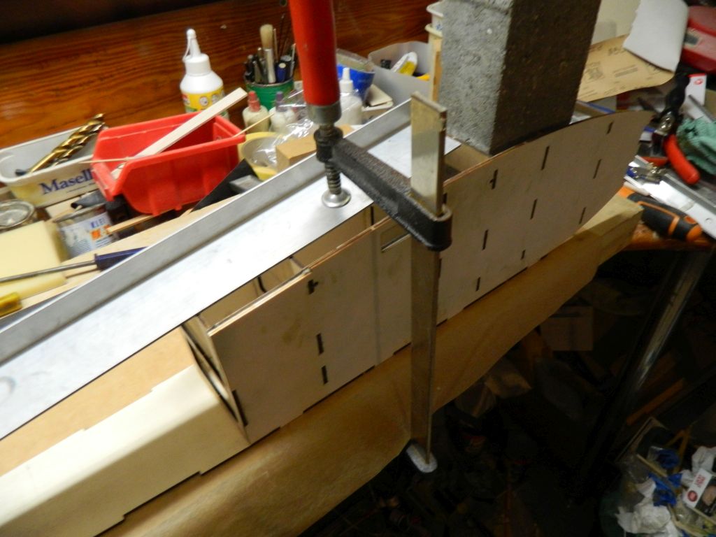 Długo zastanawiałem się jak skleić kadłub. Przede wszystkim klej musi mieć długi czas aplikacji. Wybór był prosty - klej poliuretanowy. Na początek wkleiłem wręgi w jeden z boków przedniej części kadłuba. Następnie drugi. Wykorzystałem półkę pod pakiet/serwa jako element stabilizujący, nie przyklejałem go. Podobnie jak wręgi silnikowej - jej wklejenie uniemożliwi zamocowanie później półki. Między wręgami 2-6 u dołu tam gdzie są wpusty we wręgach, wkleiłem listwę sosnową 5x5. Wszystko ustabilizowałem i skręciłem ściskami. Po wyschnięciu między wręgi 5/5.1 od spodu wkleiłem listwę 8x8. Następnie to pudełko skleiłem z dolnym poszyciem kadłuba.