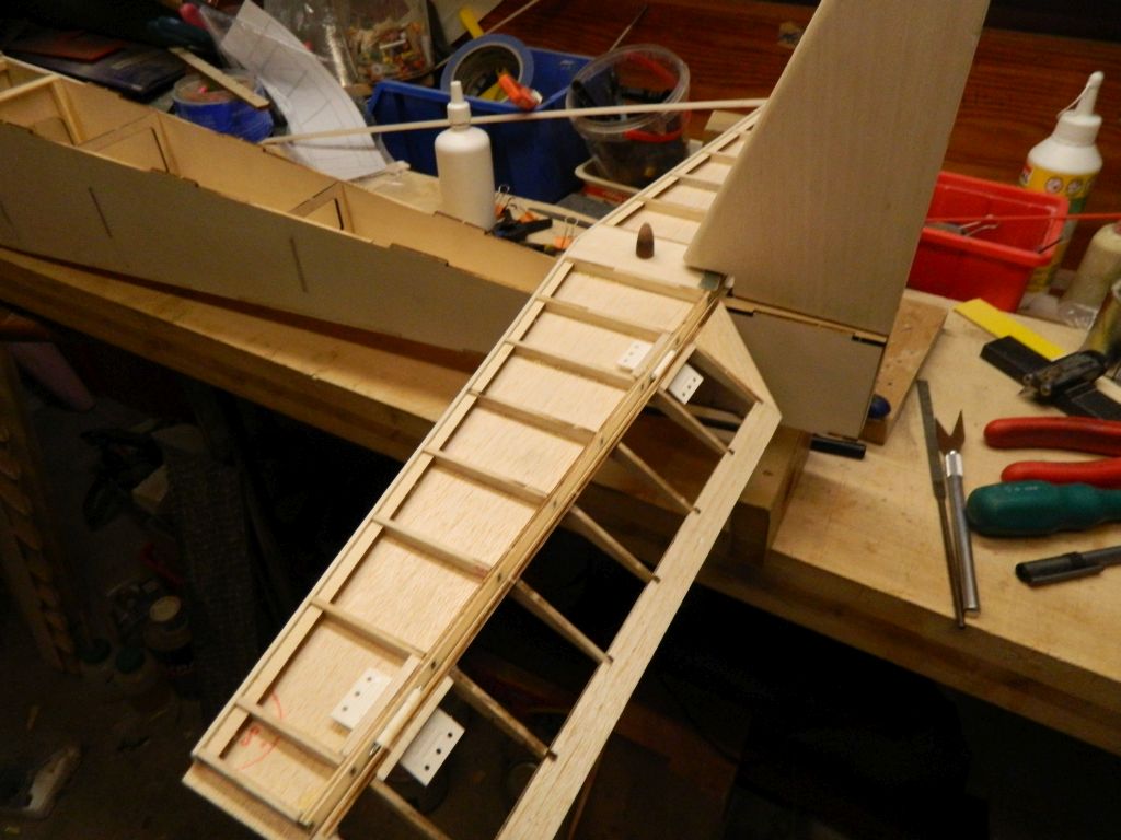 Zaczynam od statecznika pionowego. Muszę zweryfikować czy ten element pasuje do wpustów na kadłubie. Konstrukcja prosta: dźwigarek ze sklejki topolowej, żeberka również. Natarcie to listwa sosnowa 5x3 i jeszcze jeden kawałek takiej listewki w przedniej części statecznika, puste przestrzenie na szczycie pionu i listewki łącznikowej wypełnione balsą 3 i 4 mm. Na natarcie przykleję listwę balsową 2/3 mm. Po zdjęciu z deski, szlifowanie, oklejenie balsą 1.5 mm a na koniec natarcie z listwy 3/4 mm.