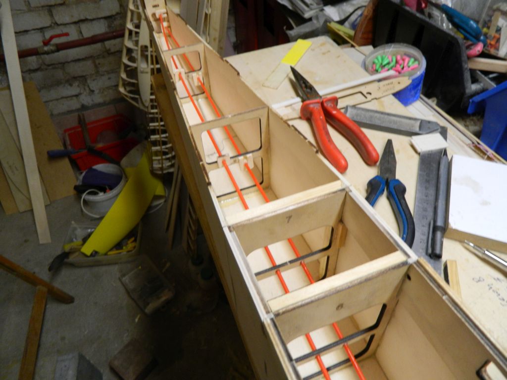 Skleiłem tylną część kadłuba. Po posmarowaniu klejem wszystkich spoin ta część została ustabilizowana w swoistym przyrządzie montażowym. Kątowniki alu, ściski i klamerki załatwiły temat. W miejscu gdzie kadłub zaczyna się zwężać - na wrędze nr 7 - wkleiłem po obu stronach listwy sosnowe 8x8. Dodałem również kawałki sklejki 3 mm w miejscu gdzie będzie przykręcone kółko ogonowe. Można montować bowdeny.
