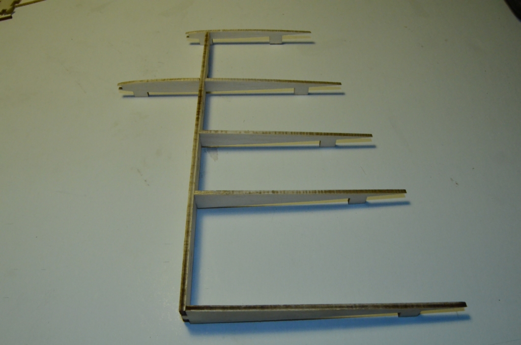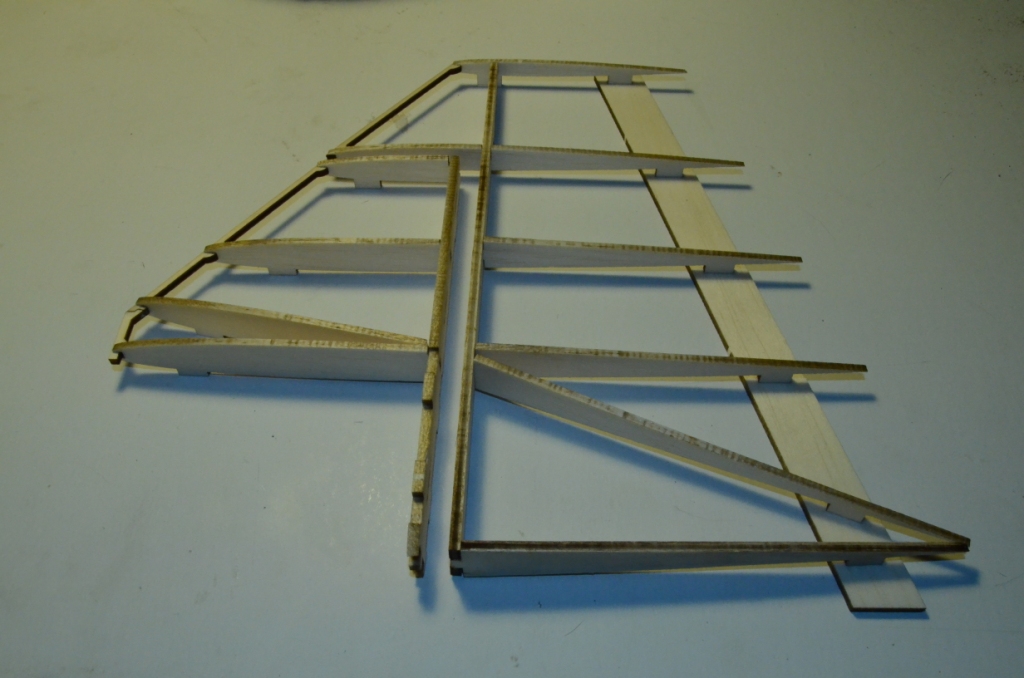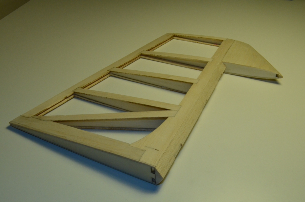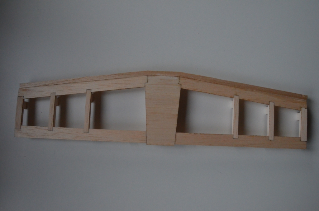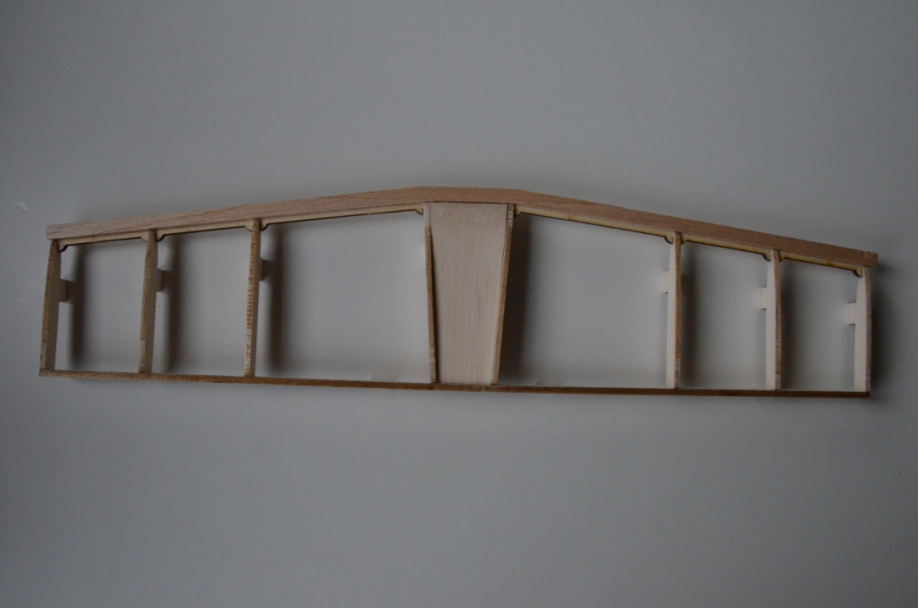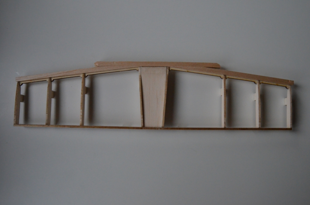 Skleiłem ze sobą łącznik natarcia z balsosklejki, dokleiłem do niego trapez z balsy, a resztę połączyłem na wpusty i klej CA.