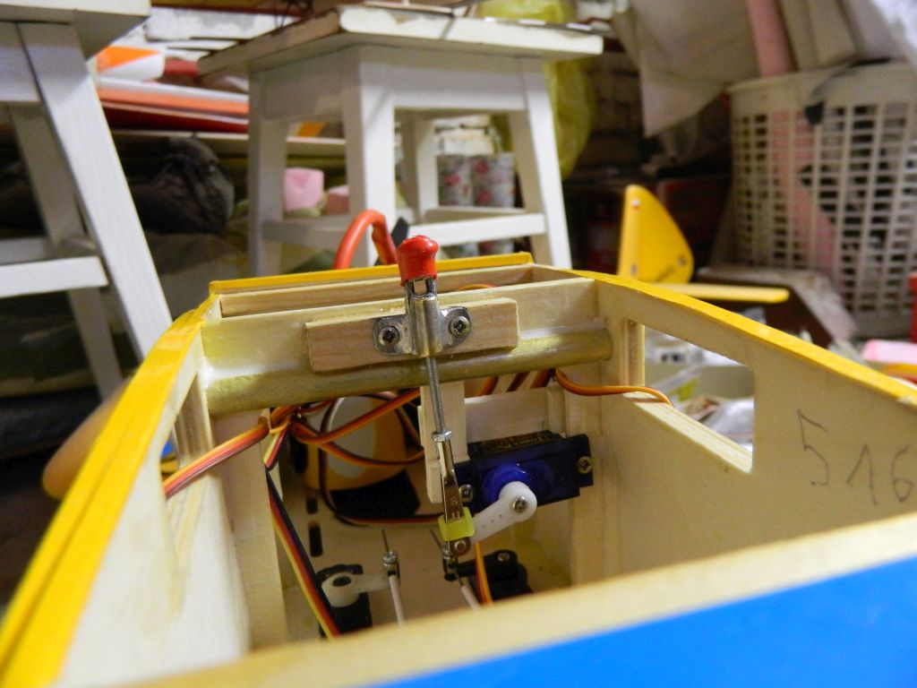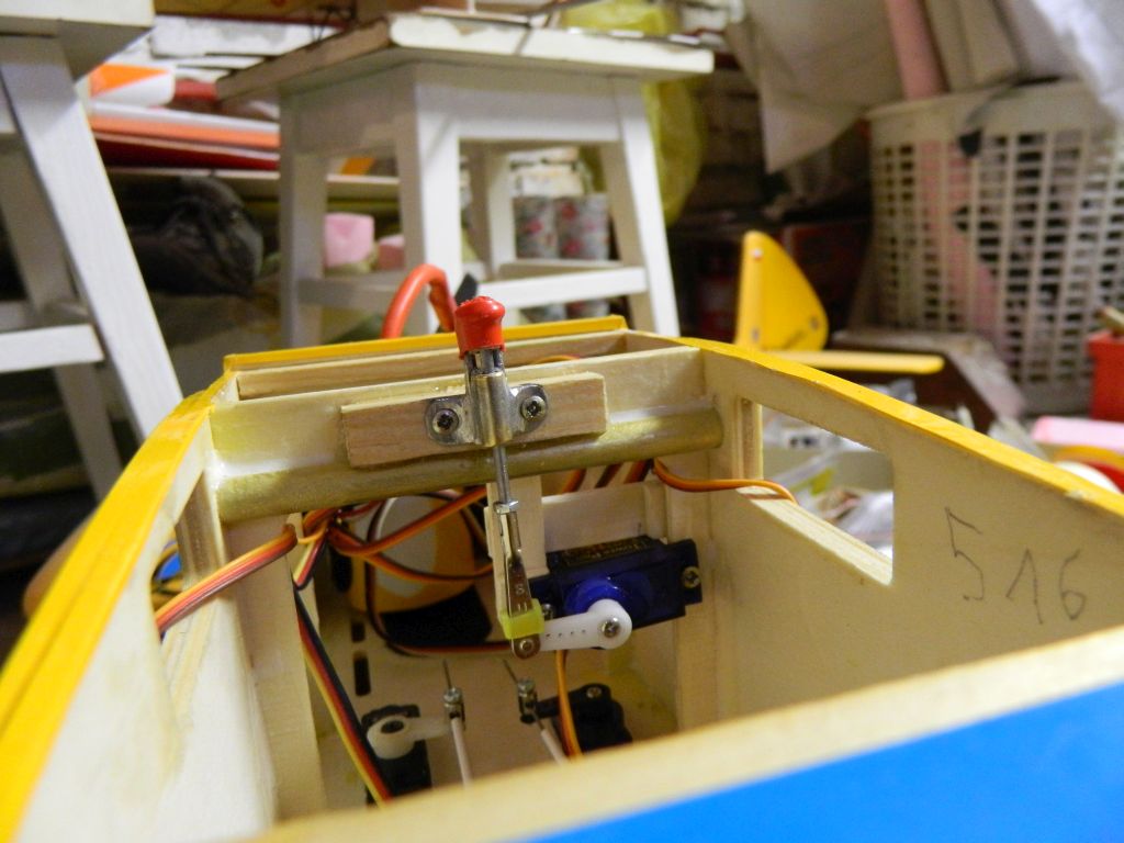 No właśnie. Dzisiaj powalczyłem z zaczepem w Tukanie. Można taką rzecz kupić, ale postanowiłem zrobić sam. Z kawałka drutu fi 2mm, nita rurkowego mosiężnego i kawałka blaszki stalowej polutowałem taki oto zaczep. Zamontowałem serwo, ze szprychy rowerowej zaczepik, wszystko poprzykręcałem, posklejałem. Serwo zaczepu zaprogramowałem mikserem "Crow" na kanale 6, pod przełącznikiem. Oczywiście była próba. Podczepiłem kawałek linki i "wyczepiałem" pod różnymi kątami, różną siłą naprężenia.... no działa . Jak pozwoli pogoda zmajstruję jakiś hol, na końcu zaczepię spadochronik od holu gumowego, polatam i wypróbuję niezawodność układu . Kilka zdań o wyposażeniu. Silnik, pakiet i regulator już opisałem. W lotkach SG-92R, podobnie ster wysokości, ster kierunku Hitec HS-85BB+, zaczep TP SG90.