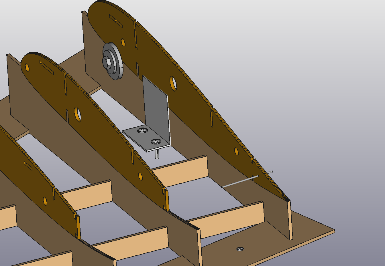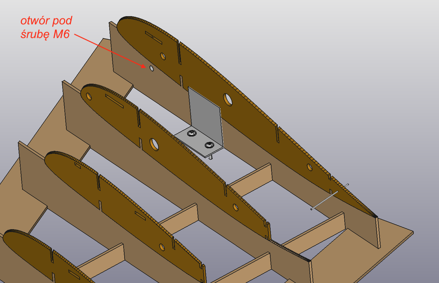 Nie chce mi się budować jakiegoś super przyrządu do montażu skrzydła. Gdyby nie udało się w miarę usztywnić i pewnie zamocować żeberek na tym "przyrządzie" przy pomocy ścisków i klamer do drewna, to wykonam kilka otworów pod śrubę M6 i usztywnię przy pomocy podkładek metalowych lub z odpadów sklejki.