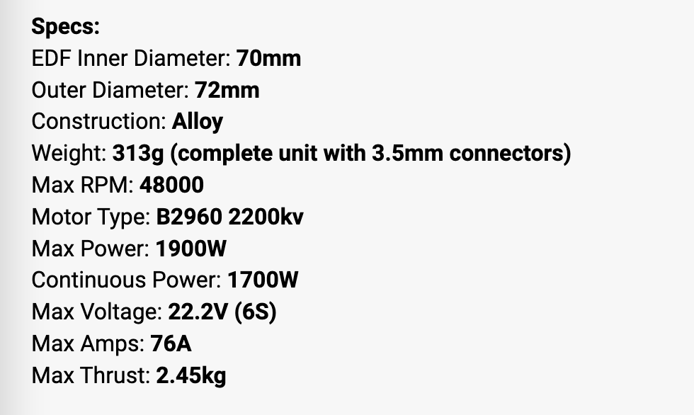 Przed rozpoczęciem wycinania elementów ze sklejki, ostatnia weryfikacja posiadanych napędów EDF. Kiedyś zostałem szczęśliwym posiadaczem takich 2 EDF (DrMad Thrust 70mm 10-Blade Alloy EDF 2200kV) - 1900watt (6s)) wraz z dedykowanymi ESC, 85 A. Wg producenta EDF ma takie parametry: