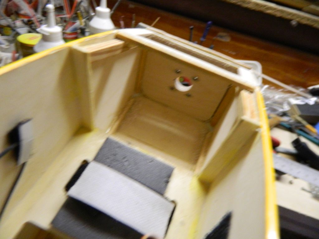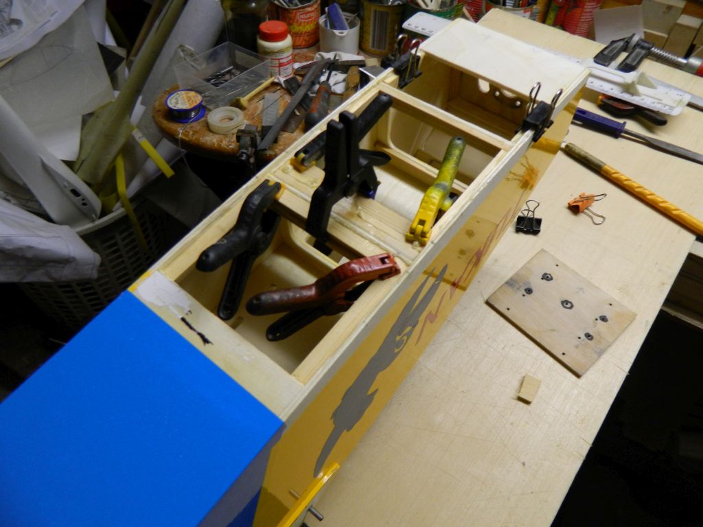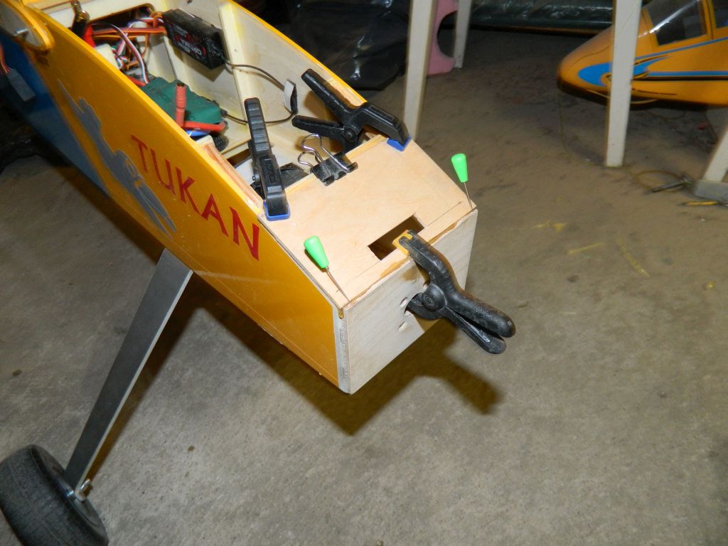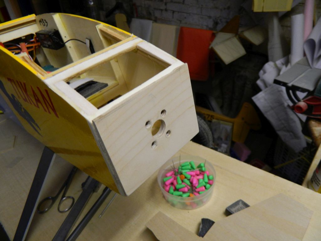 Naprawa dobiega końca. Dwie warstwy sklejki 2 mm - tak jak pisałem wcześniej - plus wzmocnienie listwami sosnowymi 5x5 mm górnej części komory silnika i pokrycie jej sklejką 2 mm. Tutaj zrezygnowałem z balsosklejki, jest słaba i moim zdaniem nie nadaje się na elementy bardzo obciążone. Oczywiście inaczej temat wygląda w skorupach. W górnym pokryciu zrobiłem otwór wentylacyjny, w czasie eksploatacji sprawdzę czy jest wystarczający czy nie. Czekam aż wszystko się sklei, połatam folią no i próby na ziemi, później w powietrzu.