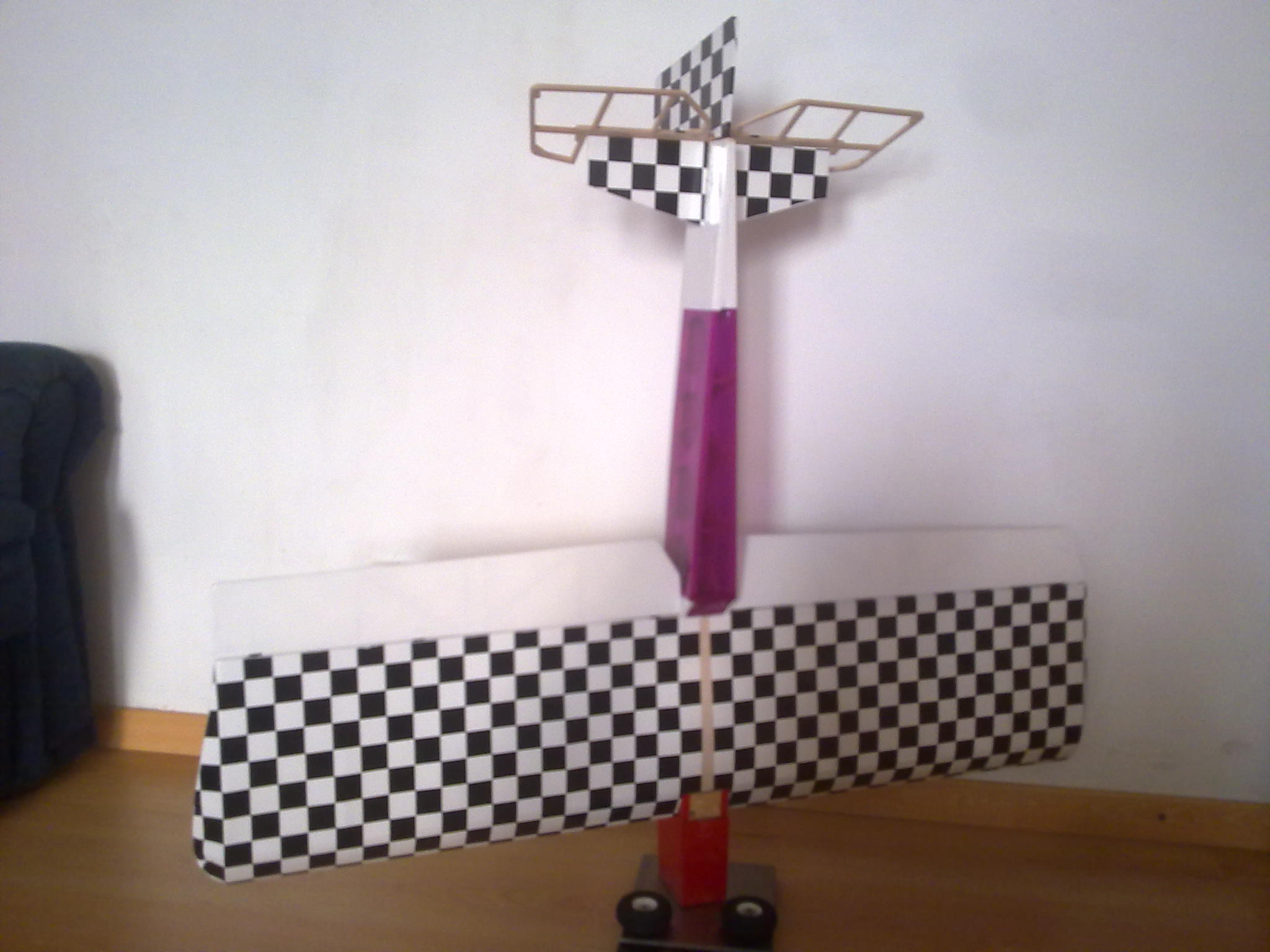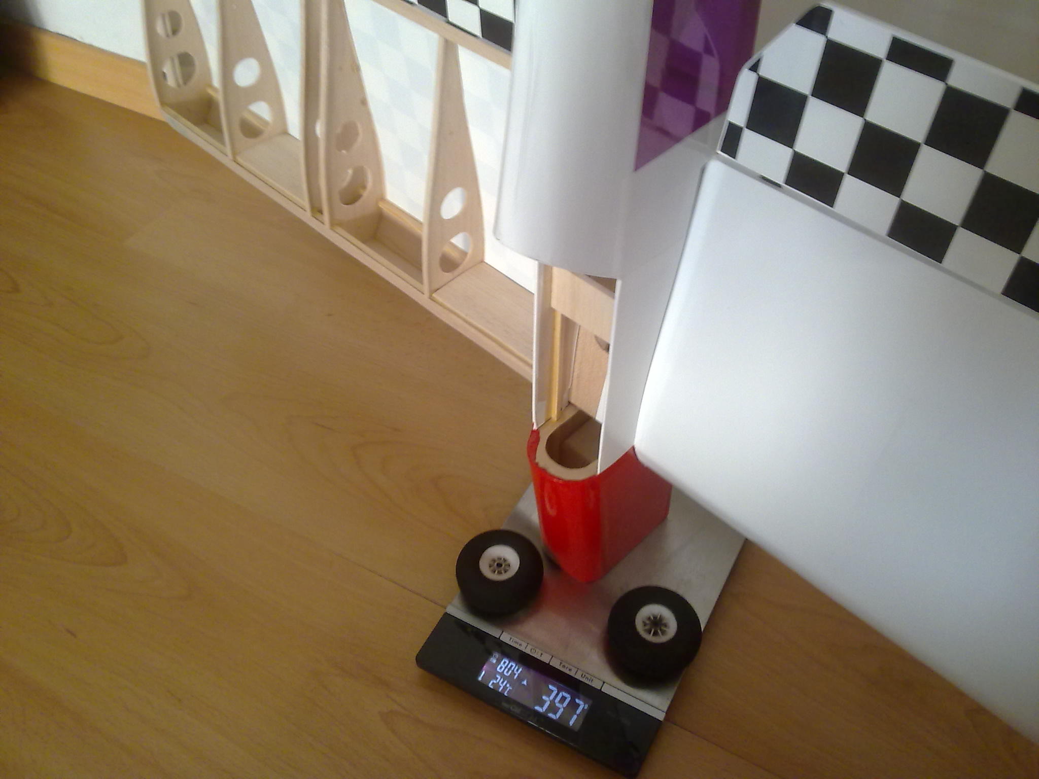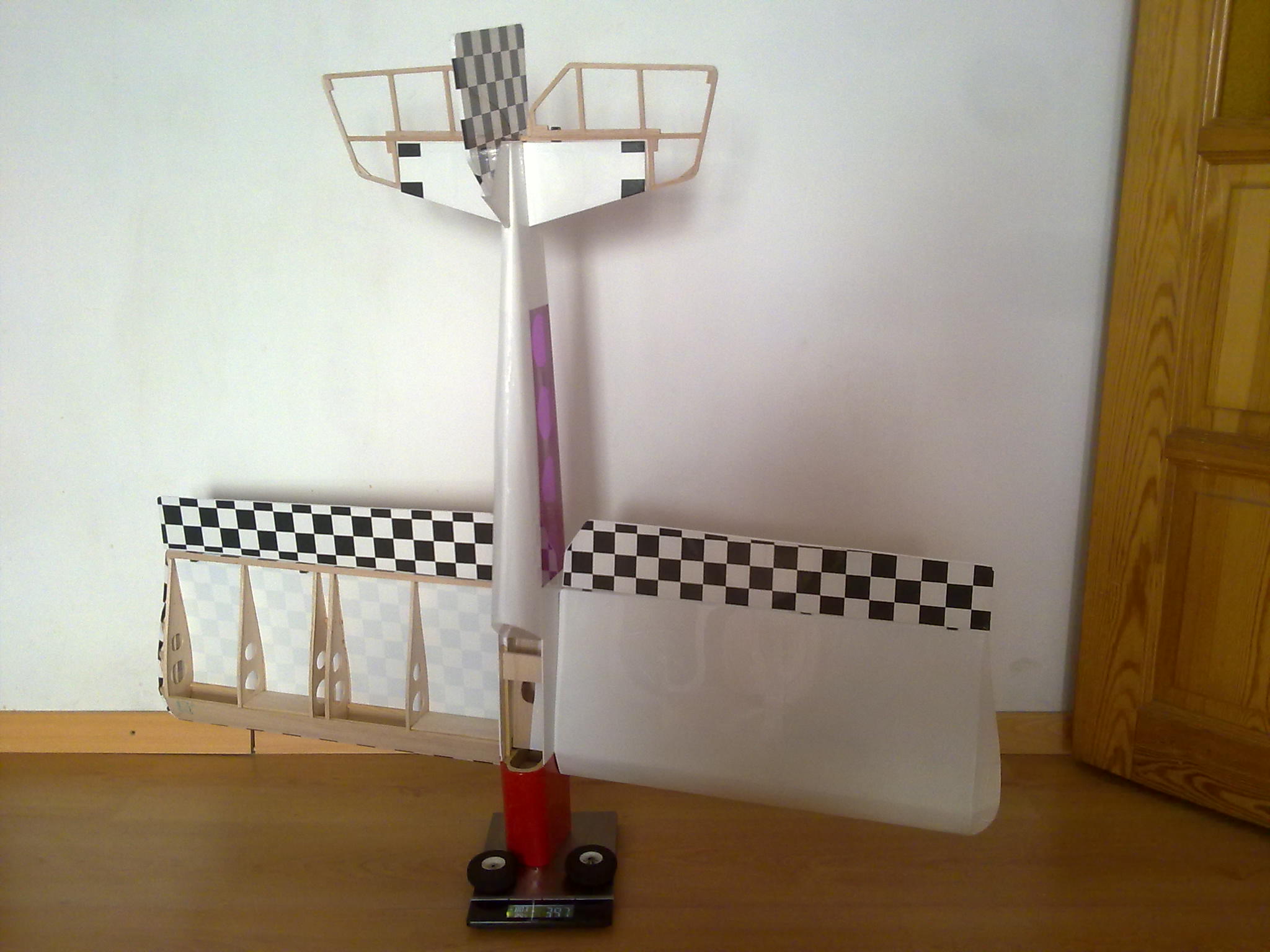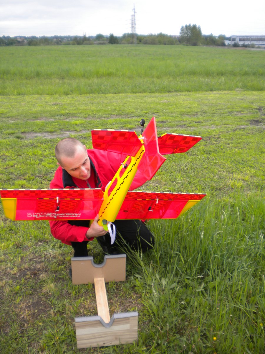 Pogoda ... pochmurno ale bez wiatru co jest najważniejsze. Najpierw palce rozgrzałem na Szerszeniu, zrobiłem jakieś dwa, trzy kółka nad lotniskiem i zacząłem powoli składać Madmana do kupy ... dla łatwiejszego i wygodniejszego skręcania i montażu pakietu śmignąłem sobie z dwóch kawałków paneli, kawałka kantówki sosnowej oraz ocieplaczy na rury do wody stojak, który zdał egzamin na piątkę