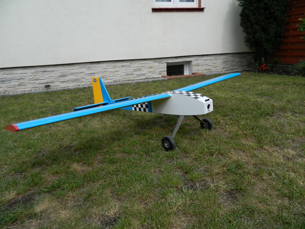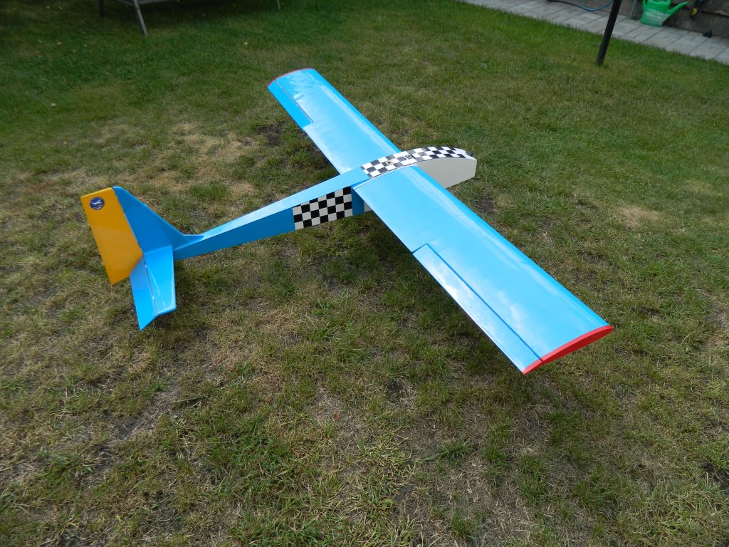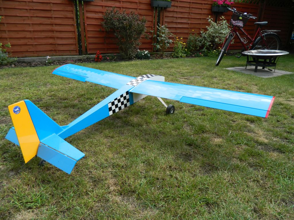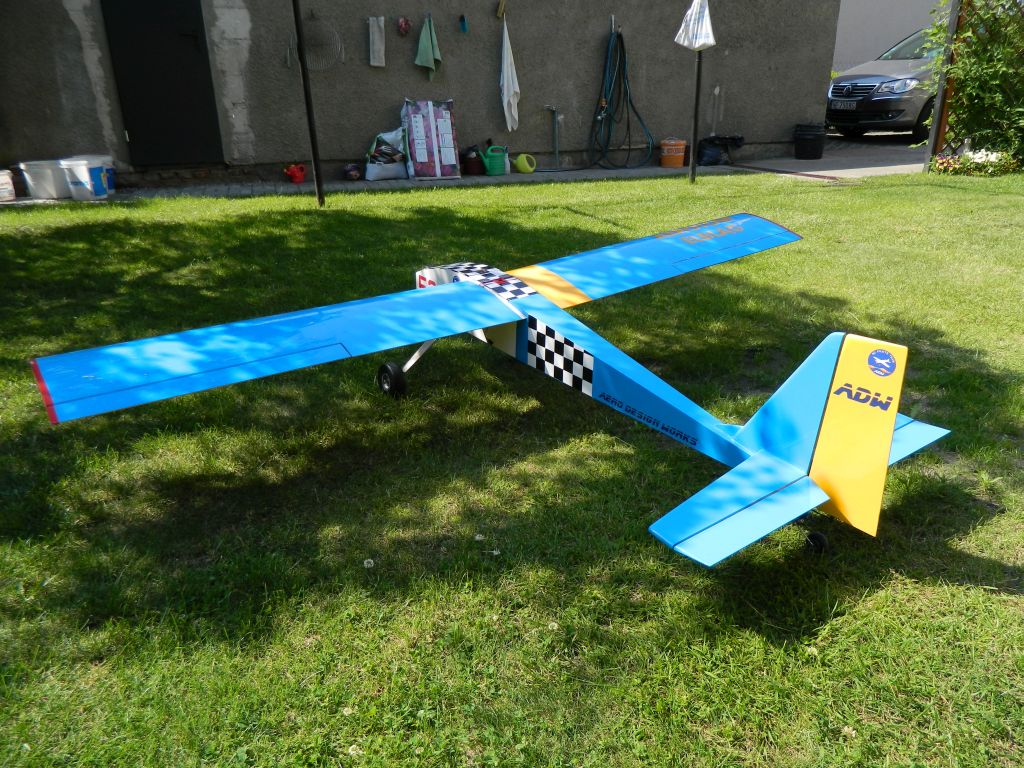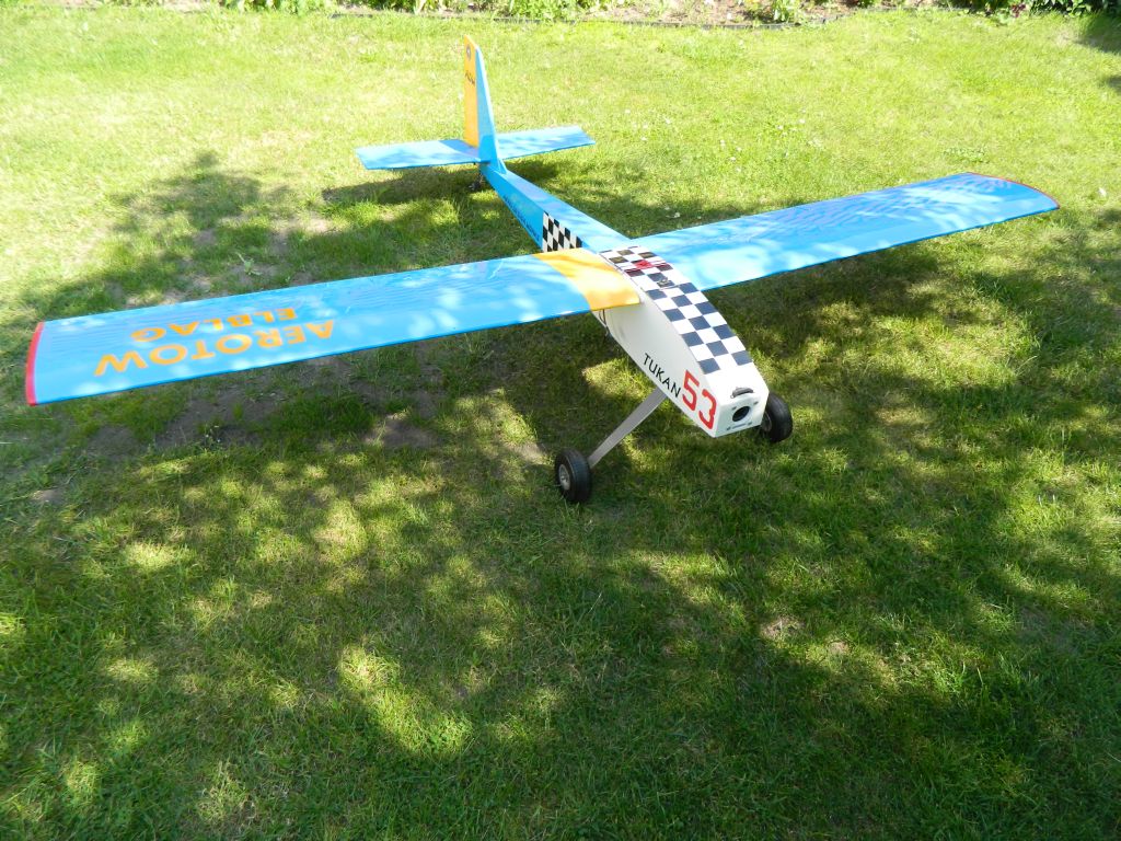 "Tukan" został w weekend uszkodzony. Może nie poważnie, ale dość rozległe były uszkodzenia. Najpoważniejszym było wyrwane żebro nasadowe prawego płata, na plus to to, że dźwigary całe, podobnie natarcie i spływ. Resztę uszkodzeń dość szybko naprawiłem. Dzisiaj uzupełniłem folię, widać żółty kawałek skrzydła u nasady, skończyła mi się niebieska folia