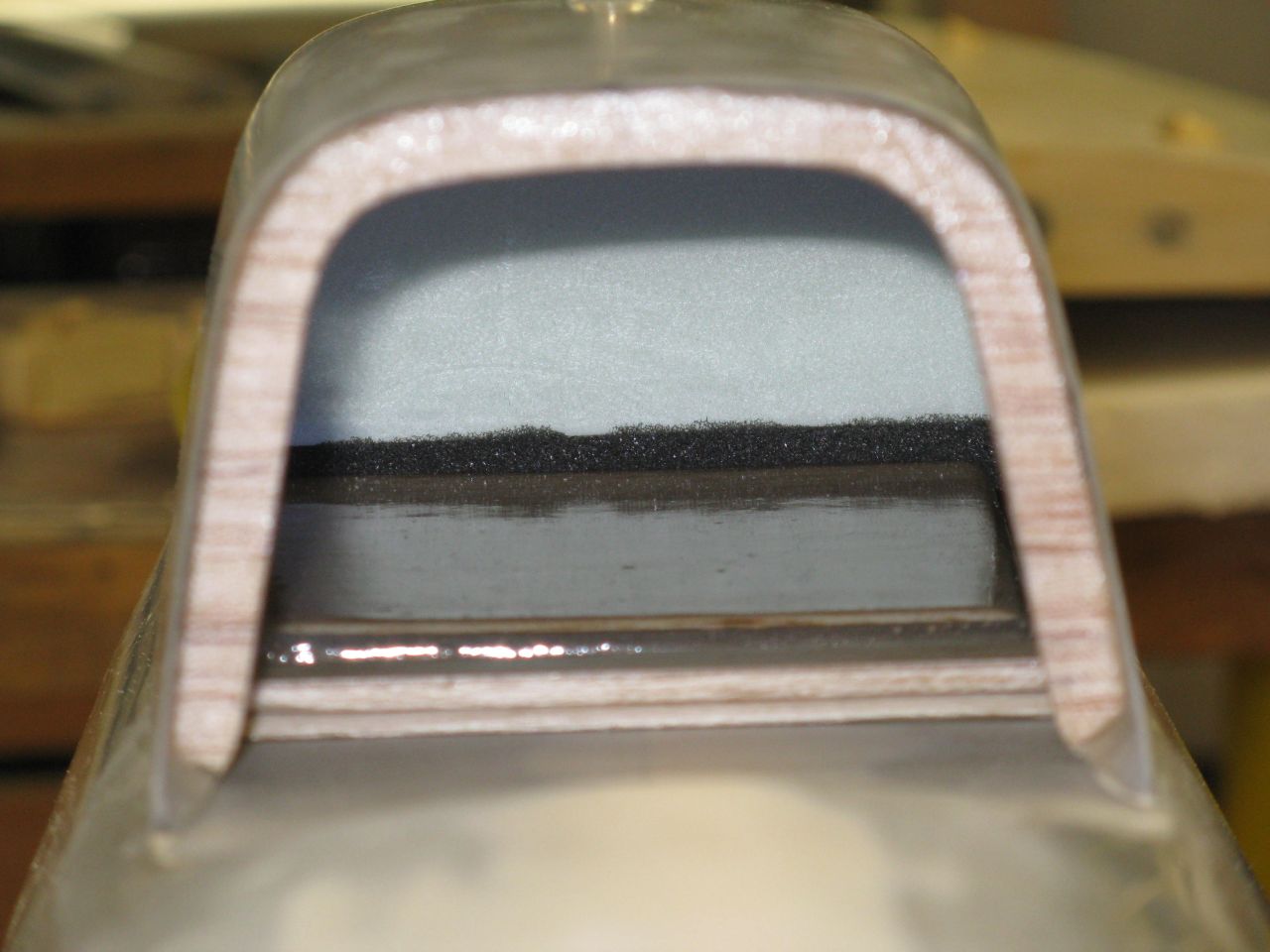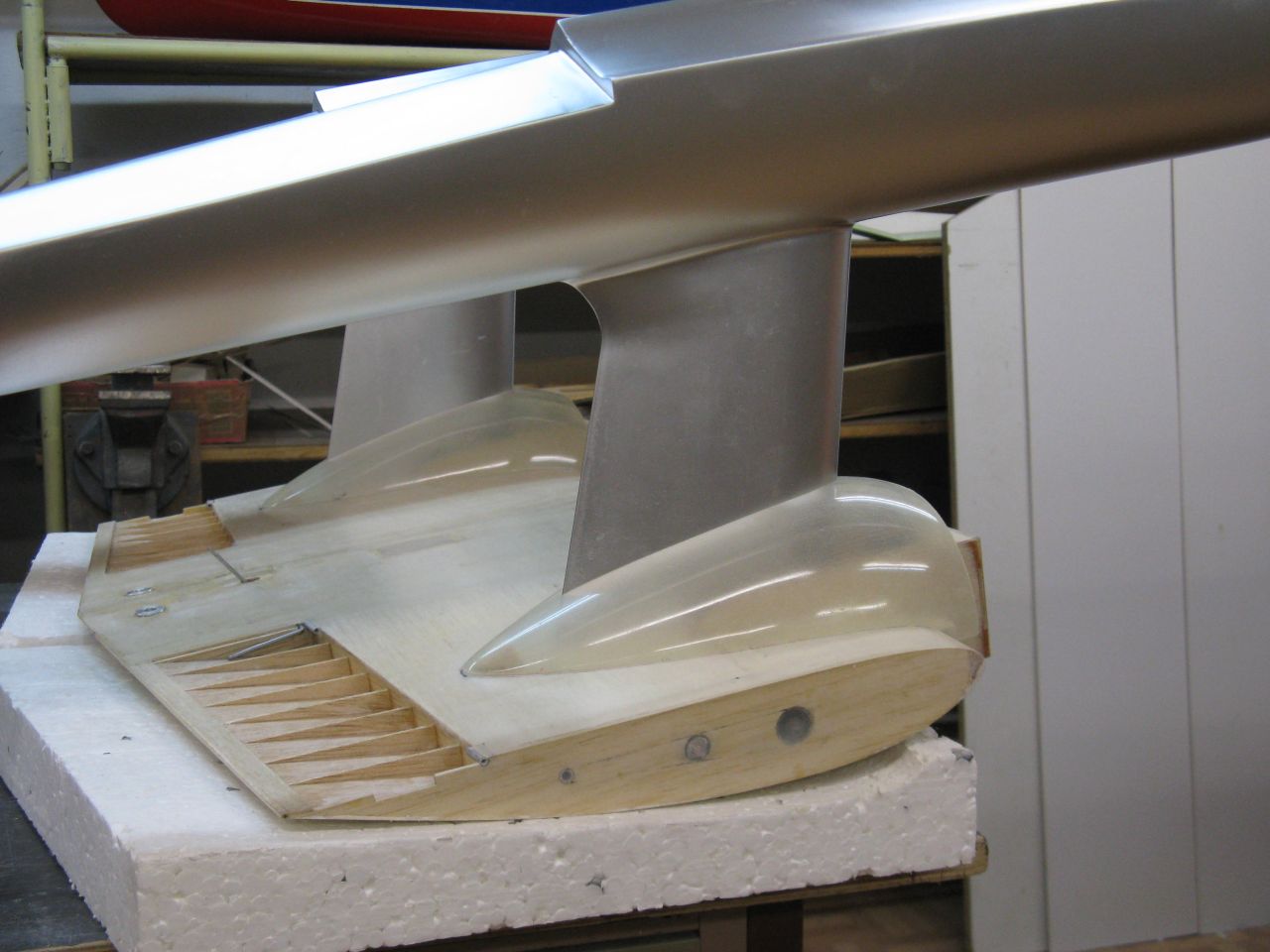 Mocowanie kabiny zrobiłem klasycznie, czyli kołeczek z przodu i dwa magnesy neodymowe z tyłu. Wklejona wręga ze styroduru z naklejoną gąbką dociska pokrywę kadłuba i zabezpiecza ją przed samoczynnym otwarciem
