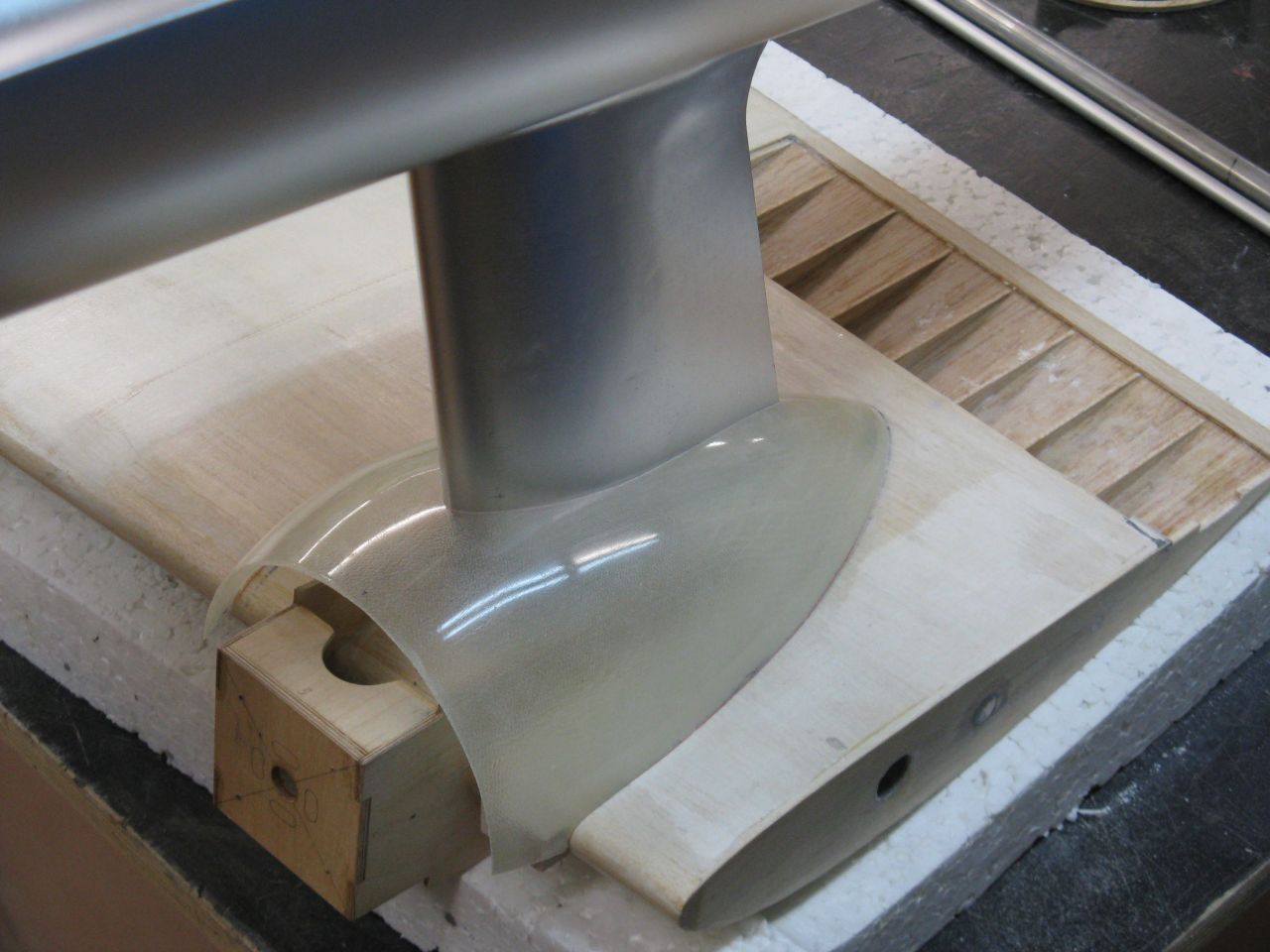 Trochę gimnastyki było z dopasowaniem osłon silników, przez które przechodziło mocowanie pływaków do skrzydeł. Początkowo chciałem przeciąć osłonę na pół, ale potem doszedłem do wniosku, że będzie ładniej jak wytnę otwór w kształcie kropli i przez niego włożę pływak.