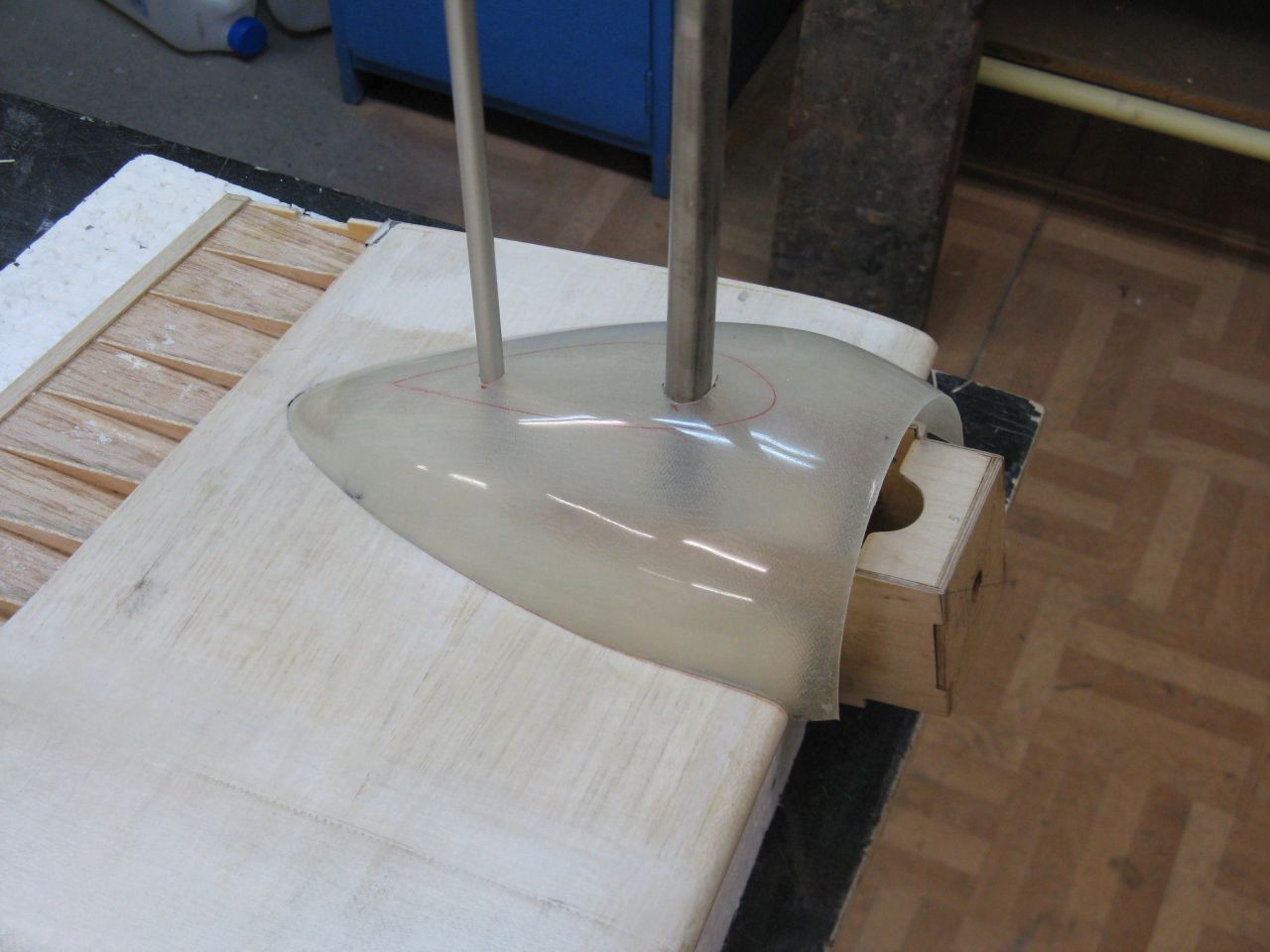 Początkowo chciałem półkę na akumulatory zrobić przykręcaną aby mieć możliwość wykonania reflektora do lądowania jak w Łosiu. Zrobiłem już nawet elementy mocujące, ale doszedłem do wniosku, że wklejenie tej półki przyniesie większą korzyść niż zrobienie reflektora ;) . Po pierwsze - wzmocni zdecydowanie przód stając się elementem konstrukcyjnym trwale związanym z bokami kadłuba tym samym usztywniając konstrukcję, po drugie - uprości procedurę montażu półki bo odpadnie kwestia gimnastyki z tulejkami, śrubkami i innymi nieprzewidzianymi historiami, po trzecie - stworzy zamkniętą i szczelną przestrzeń z przodu kadłuba. Dlatego też wkleiłem półkę i zalaminowałem połączenie paskami tkaniny 48g.