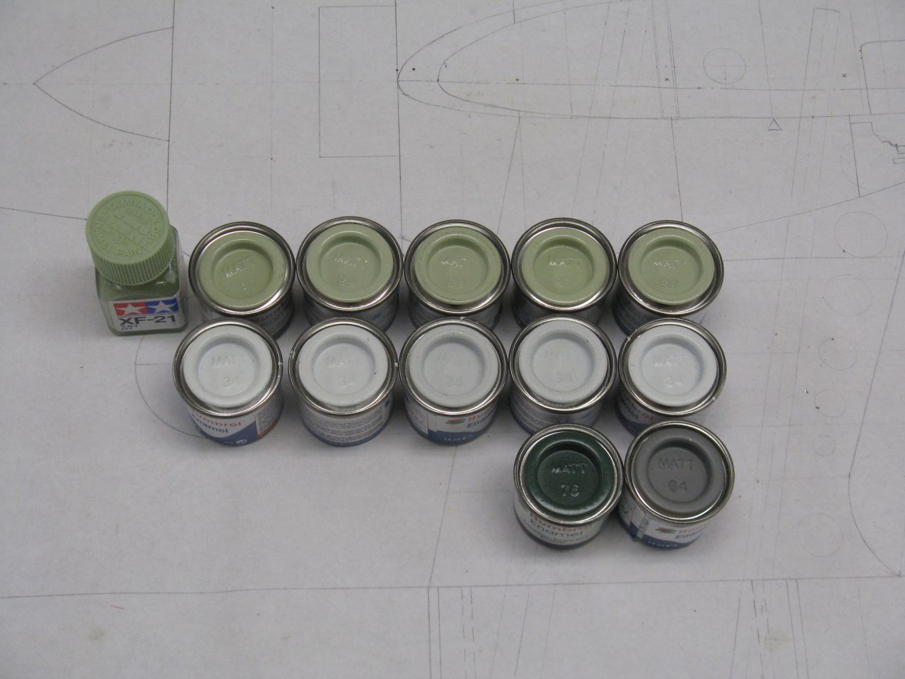 Wracając do modelu - Pomijając fakt, że nikt nie wie jak powinien wyglądać RWD-22, bo go po prostu nie było, to kwestia malowania jest nie mniej enigmatyczna. Tak jak w przypadku polskiego khaki, tak i barwa samolotów lotnictwa morskiego jest trudna do zdefiniowania. Według materiałów do których dotarłem, jest to kolor określany w tabeli barw Federal Standard jako FS 34410 (szarozielony). Oczywiście żeby było trudniej - żadna modelarska firma produkująca farbki, nie robi takiego koloru, bo i po co? Żaden sprzęt w czasie IIWŚ nie był malowany tym kolorem, tylko ponoć nasze wodnosamoloty. Trzeba więc go zrobić i do tego celu należy zmieszać ze sobą 4 różne kolory Humbrola w odpowiednich proporcjach: 6 cz.- H90, 5 cz.- H34, 1 cz.- H76, 1cz.- H64.
