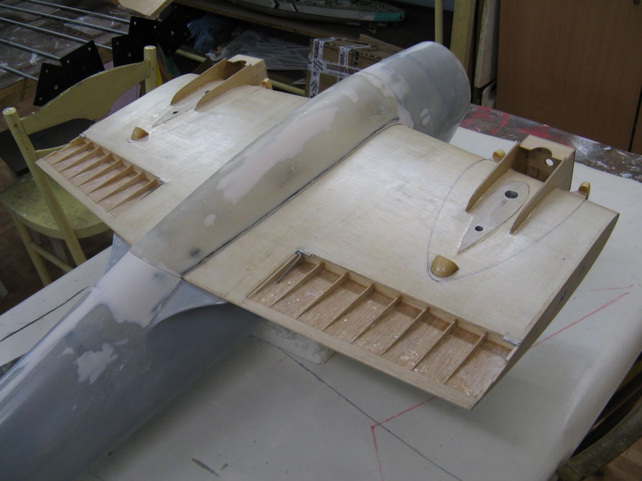 Trochę prac przy kadłubie. Pokrywa luku pod kabiną pilota, która ma na celu uszczelnienie modelu przed dostaniem sie wody, oraz fragment kadłuba pod skrzydłami.