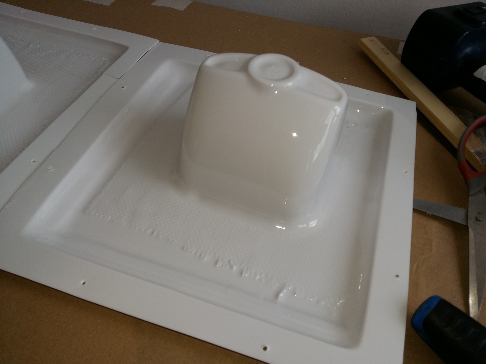 Zrobiłem pewne ulepszenie i mordki wychodzą "sto na sto" Na zdjęciach próby. Jedna lekko nie dociągnięta. Druga wyszła(by) idealnie ale pod wytłoczkę zassane zostały resztki zbrojenia uszczelki i zrobiły się rysy. To i tak próby więc nie przejmuję się tym. Kiedyś zrobiłem próbę głębokiego tłoczenia i też prawie wyszło ale miałem za cienki materiał.