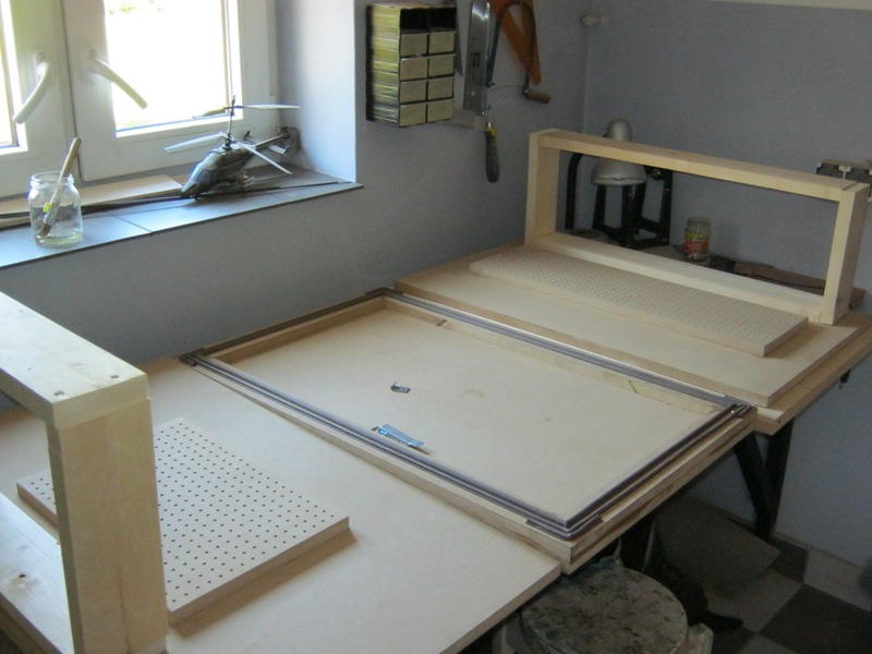 Stolik do formowania prawie gotowy, niestety zabrakło troszkę czasu do dokończenia i zajęło mi to więcej czasu niż się spodziewałem. Zostało tylko zrobić śruby mocujące blat z komorą, zrobić otwór na odkurzacz oraz podocinać i polutować metalową dolną ramkę trzymającą materiał. Na zdjęciach poniżej: