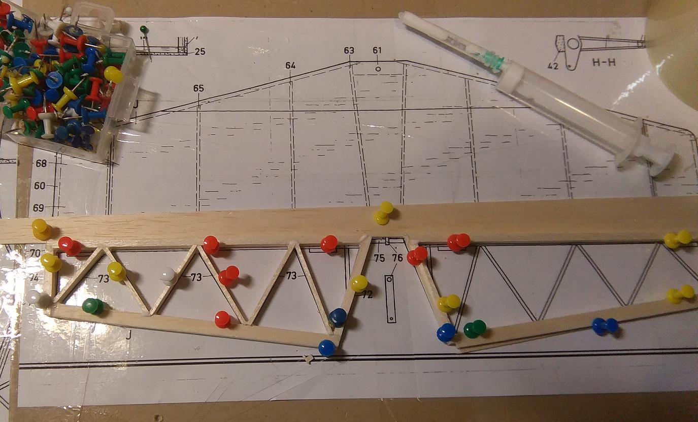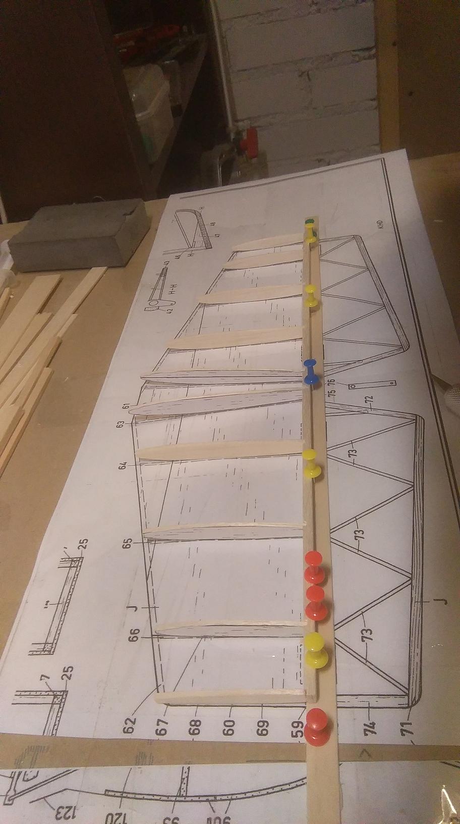 Skrzydł : - żeberka balsa 2 mm ewentualnie pierwsze i 3-cie ze sklejki 1,5mm lub 2 mm. Skrzydło okleję balsą 1,5mm a dźwigar 2 listewki 3x5 zamykany z jednej strony. Wszystko mam zamiar pokryć koverall-em. Czas pokaże co mi z moich planów wyjdzie.
