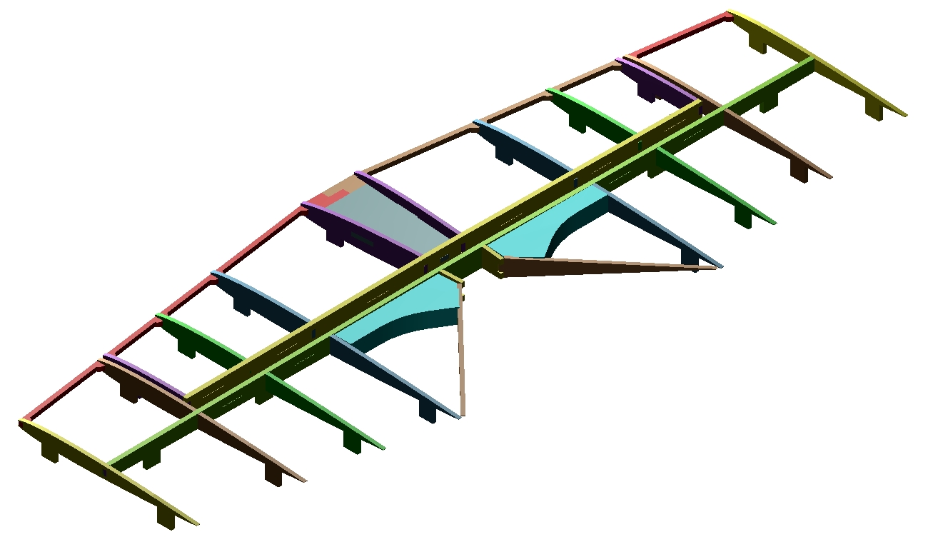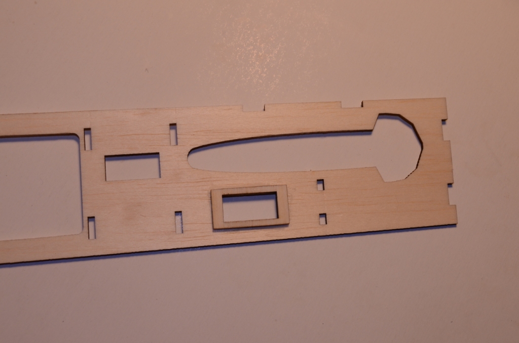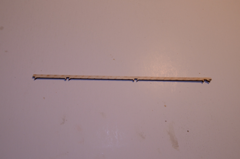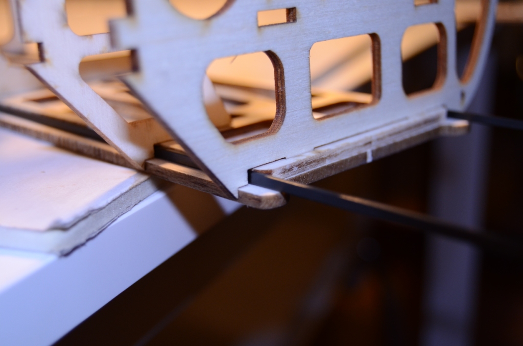 I jeszcze jeden kawałek listwy sosnowej - przechodzi on przez 2 otwory na środku pierwszych wręg i zatrzymuje się na trzeciej. Zostanie on finalnie przyklejony (żywicą) do półki podwozia.