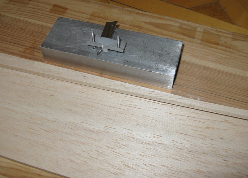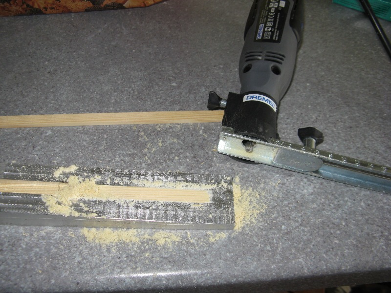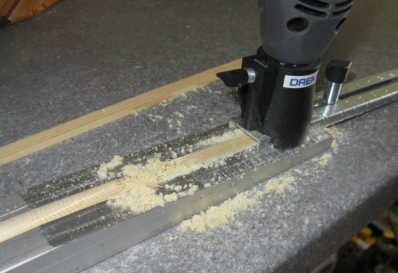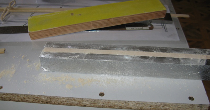 Wykonałem tez przystawkę do frezowania listew na dźwigary. Listwy musza mieć około 150cm, skleję z dwóch na zakos 1: 12 oraz owinę nicią kewlarową ( plecionka wędkarska) w teście tak to wygląda. Frezowany pod kątem profil aluminiowy z rowkiem, w który dopasowana jest listwa dźwigara + dremel z frezem.